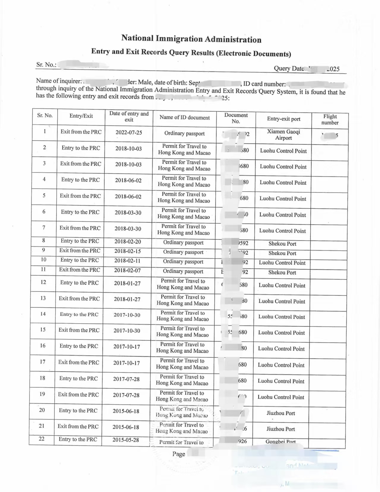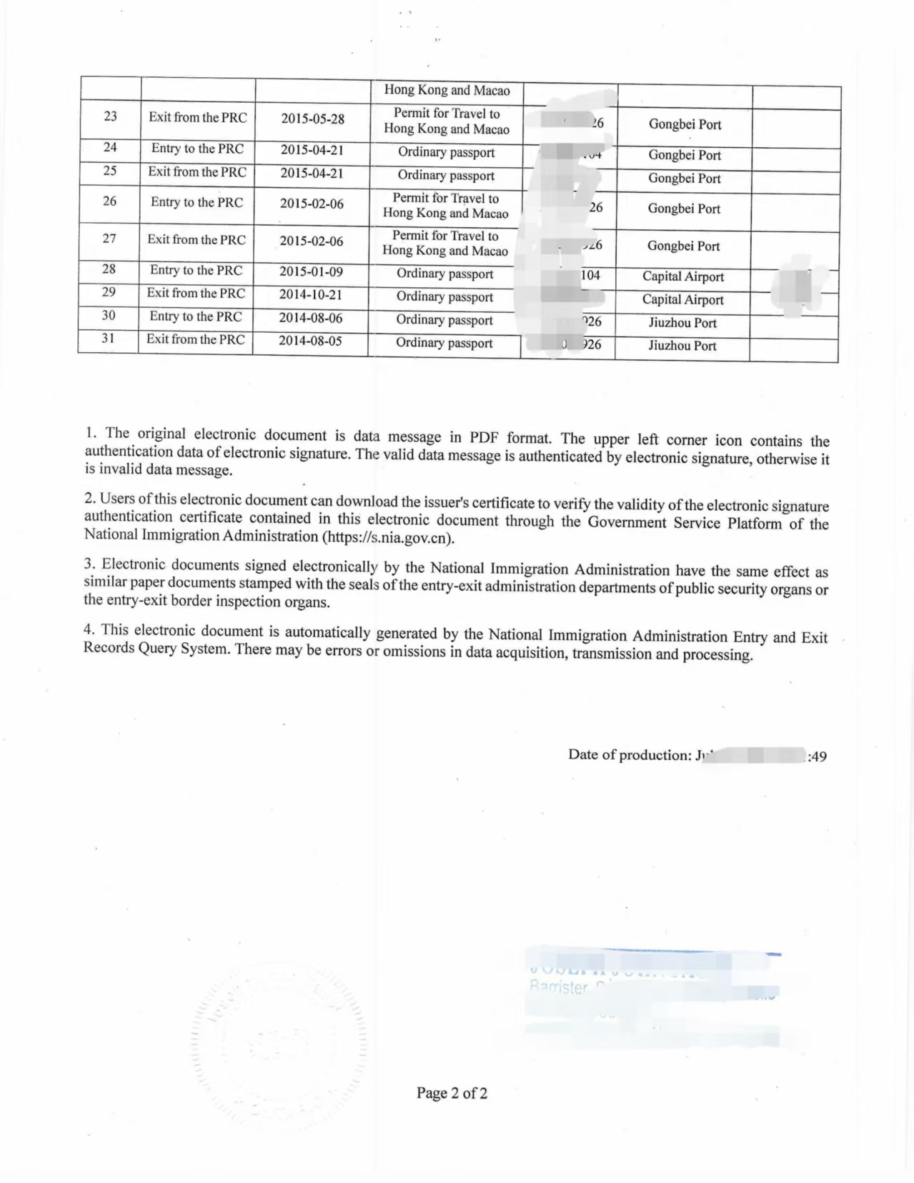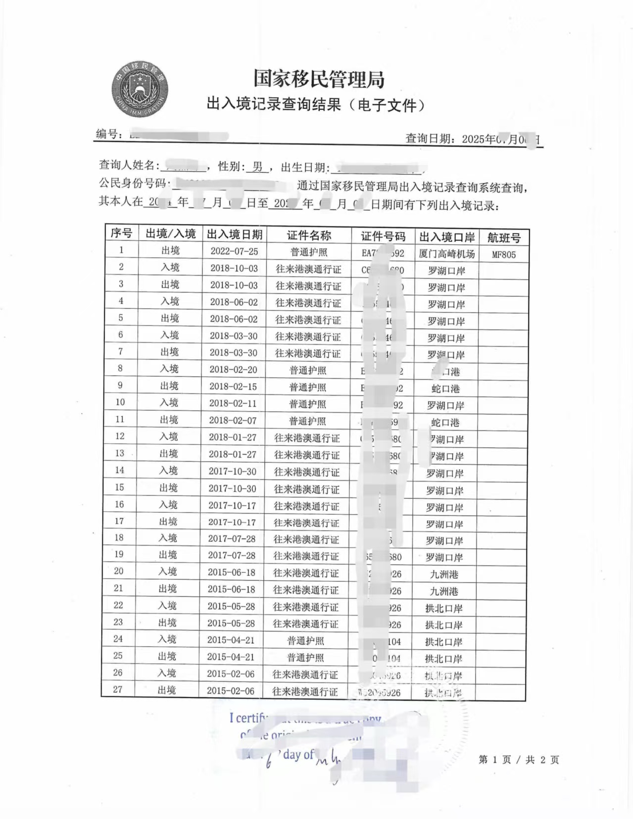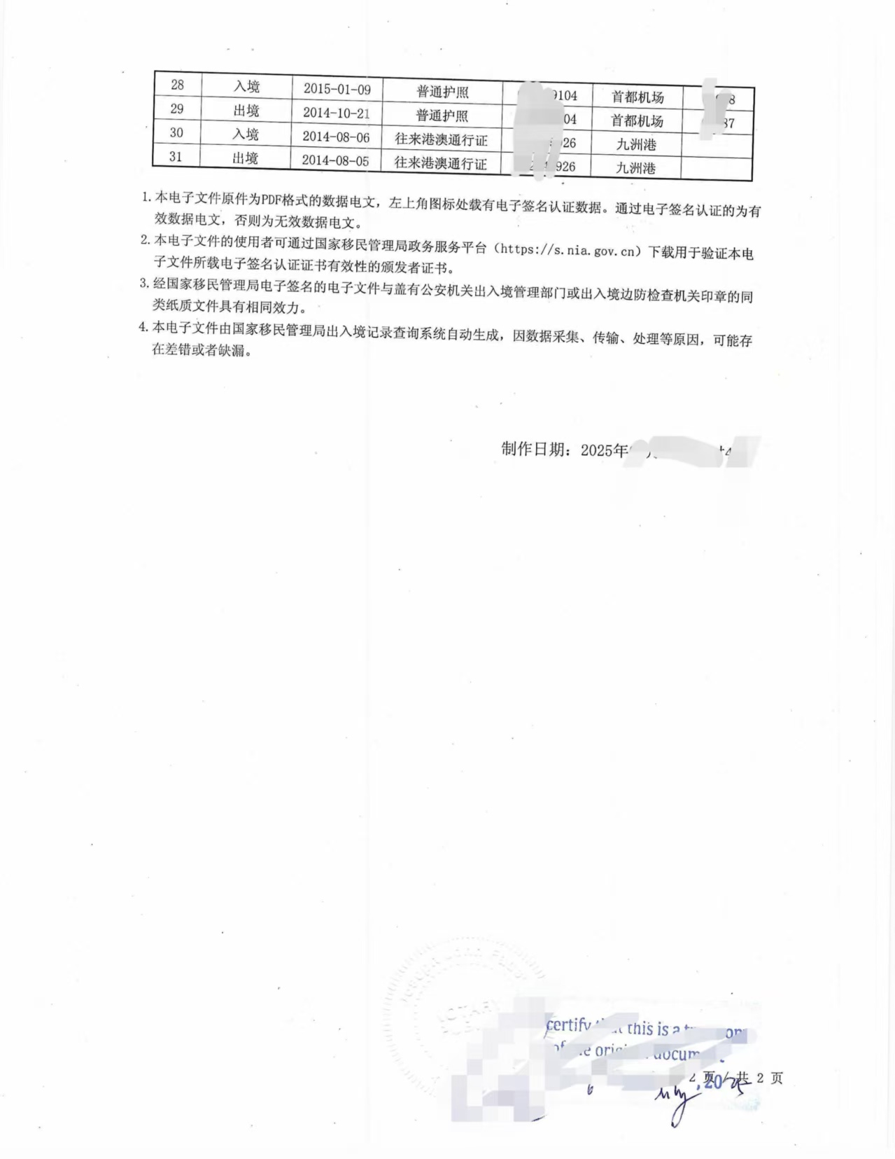 中国移民管理局出入境记录(纸质版/电子版)