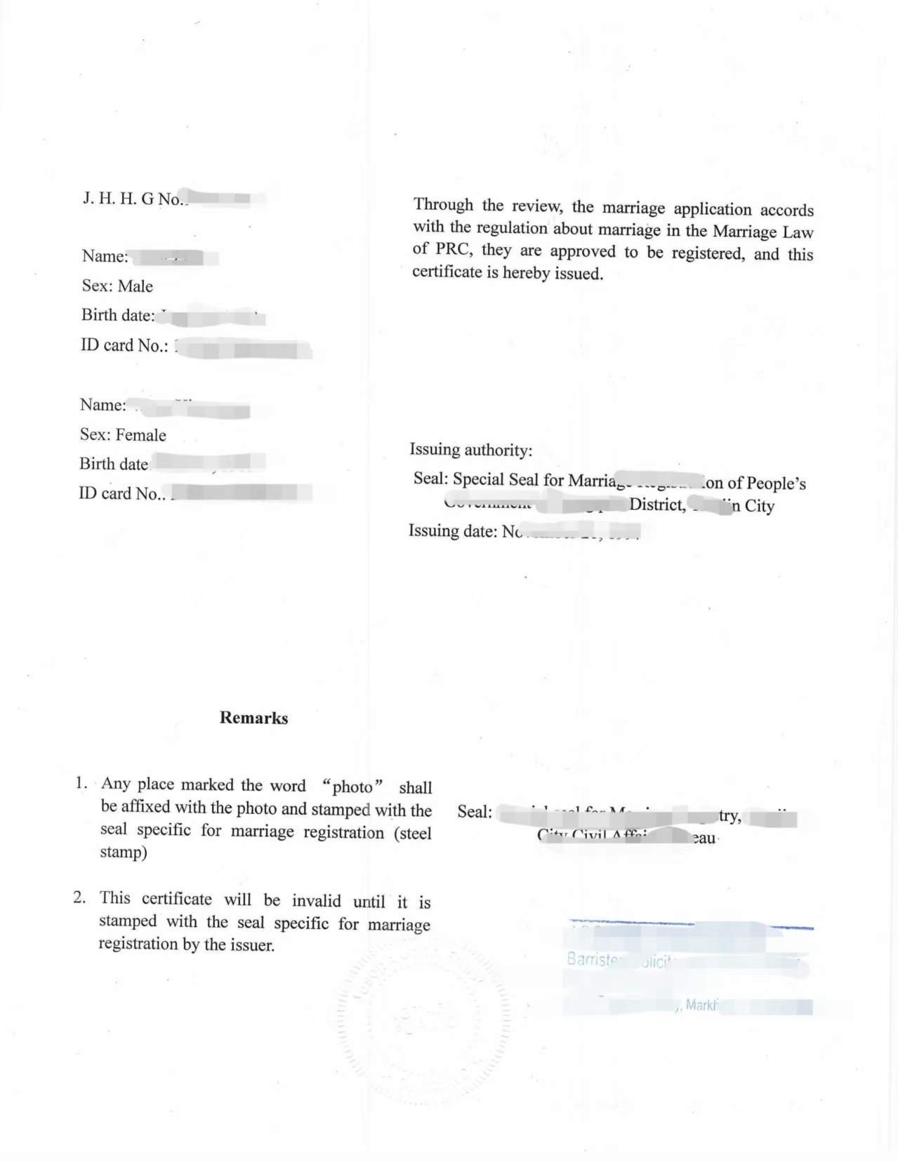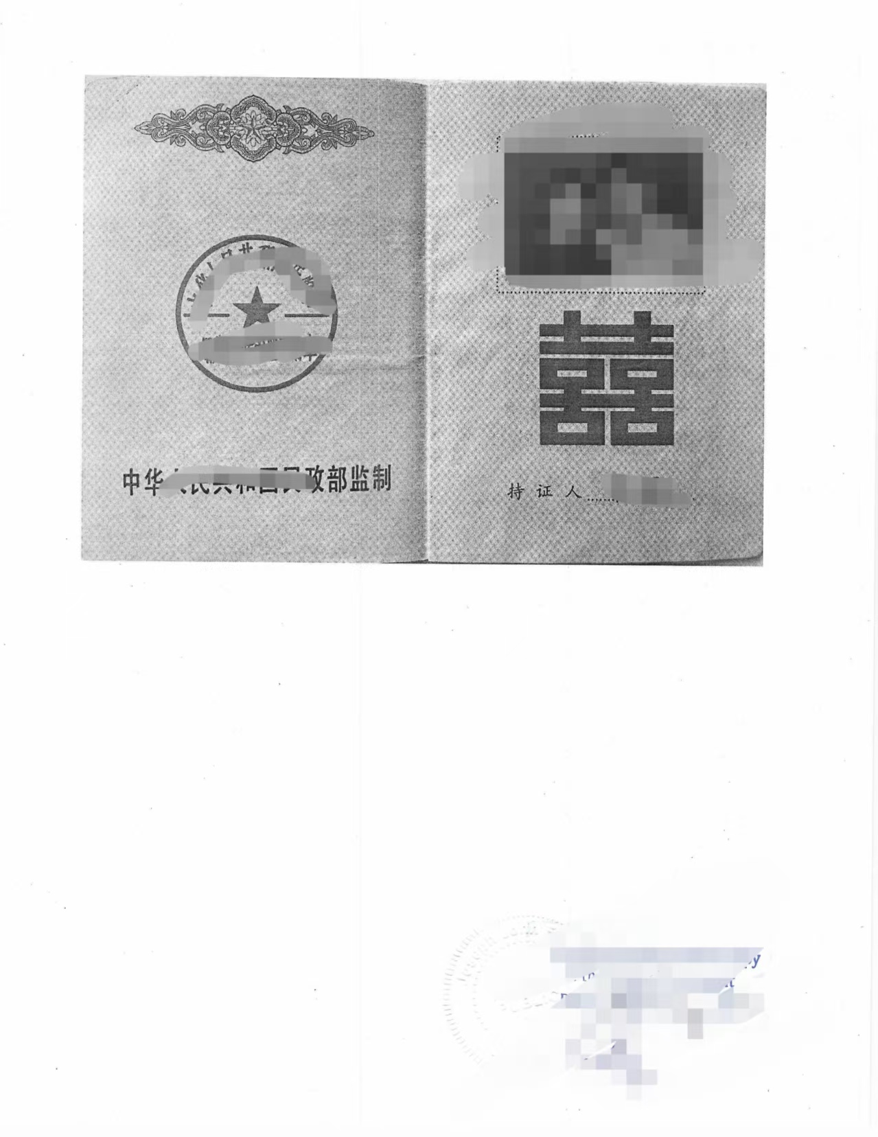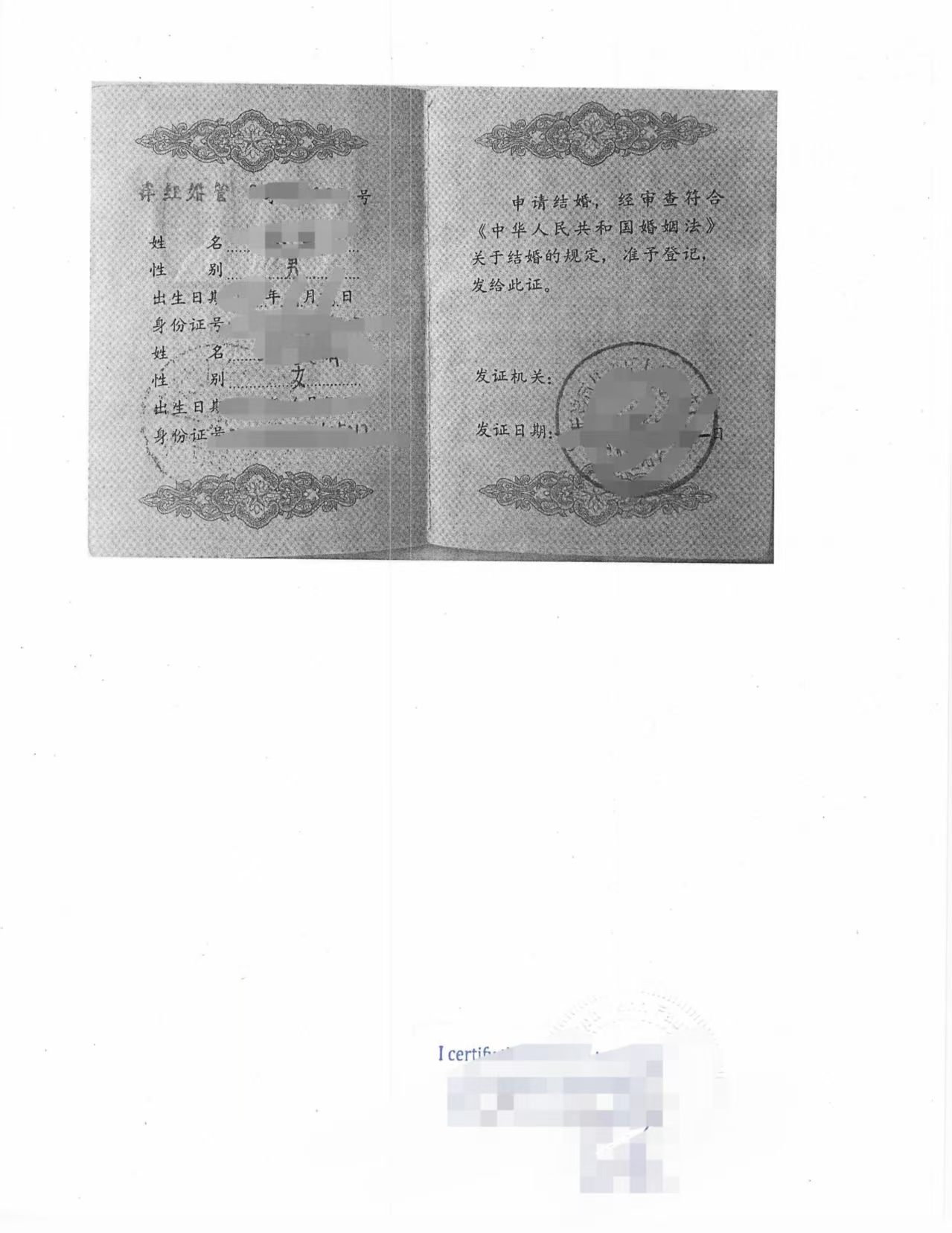 文件形式:中国结婚证扫描件(手机拍照,清晰)