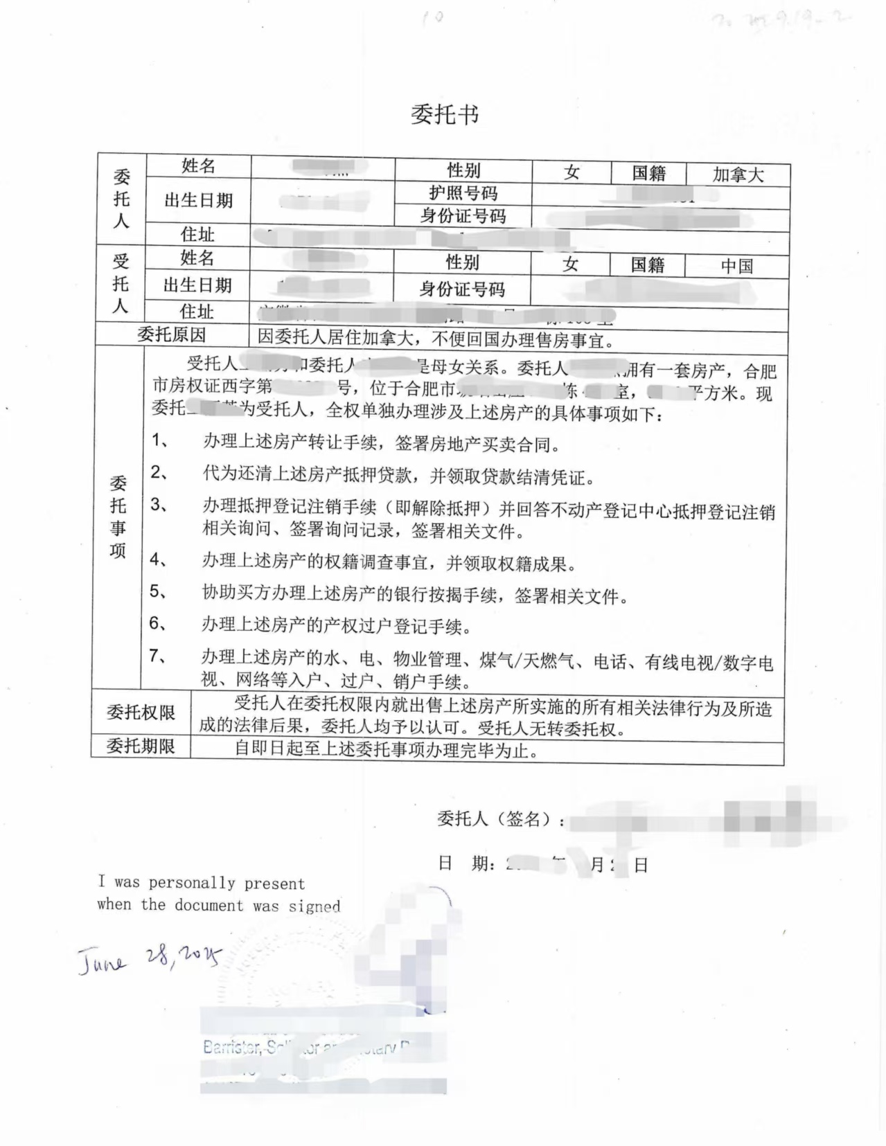 加拿大华人出售中国安徽合肥房产,委托书完成海牙认证并附加证明,全程远程办理