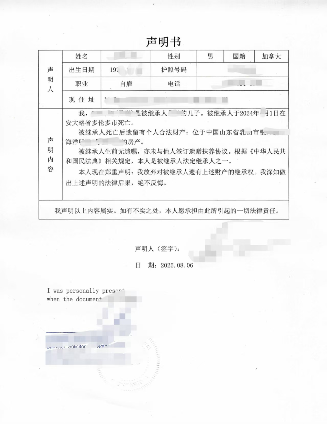 申请人 Peter Wang(加拿大公民,原中国籍)父亲在山东省去世后,遗留一处房产。Peter 作为第一顺位继承人之一,因为长期在加拿大定居且无意回国处置该房产,决定出具放弃继承权声明书,授权国内其他继承人办理房产过户。