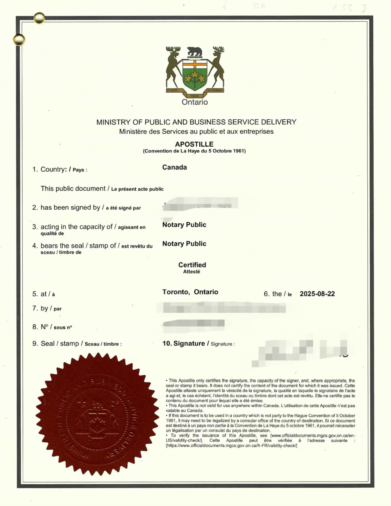 跨省操作灵活:文件在温哥华签署,却能在多伦多完成海牙认证,显示出加拿大认证体系的高度灵活性。