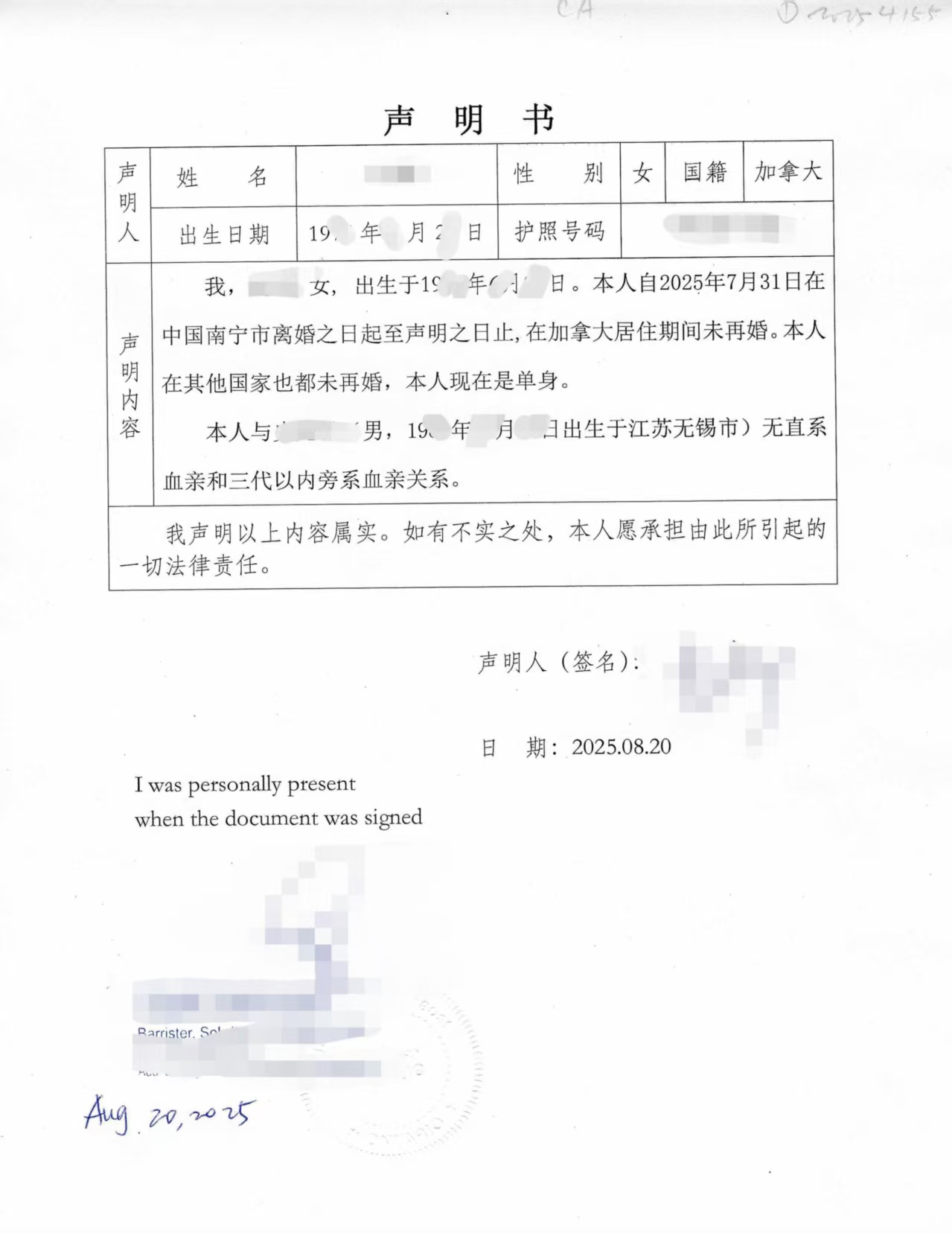 在我们的指导下,李女士在温哥华签署了一份“未再婚声明书”,声明自中国离婚后至今未在加拿大或其他国家办理婚姻登记。