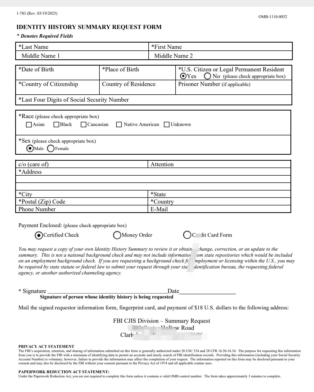 20252177 美国身份历史摘要申请表样本 Identity History Summary Request Form pdf