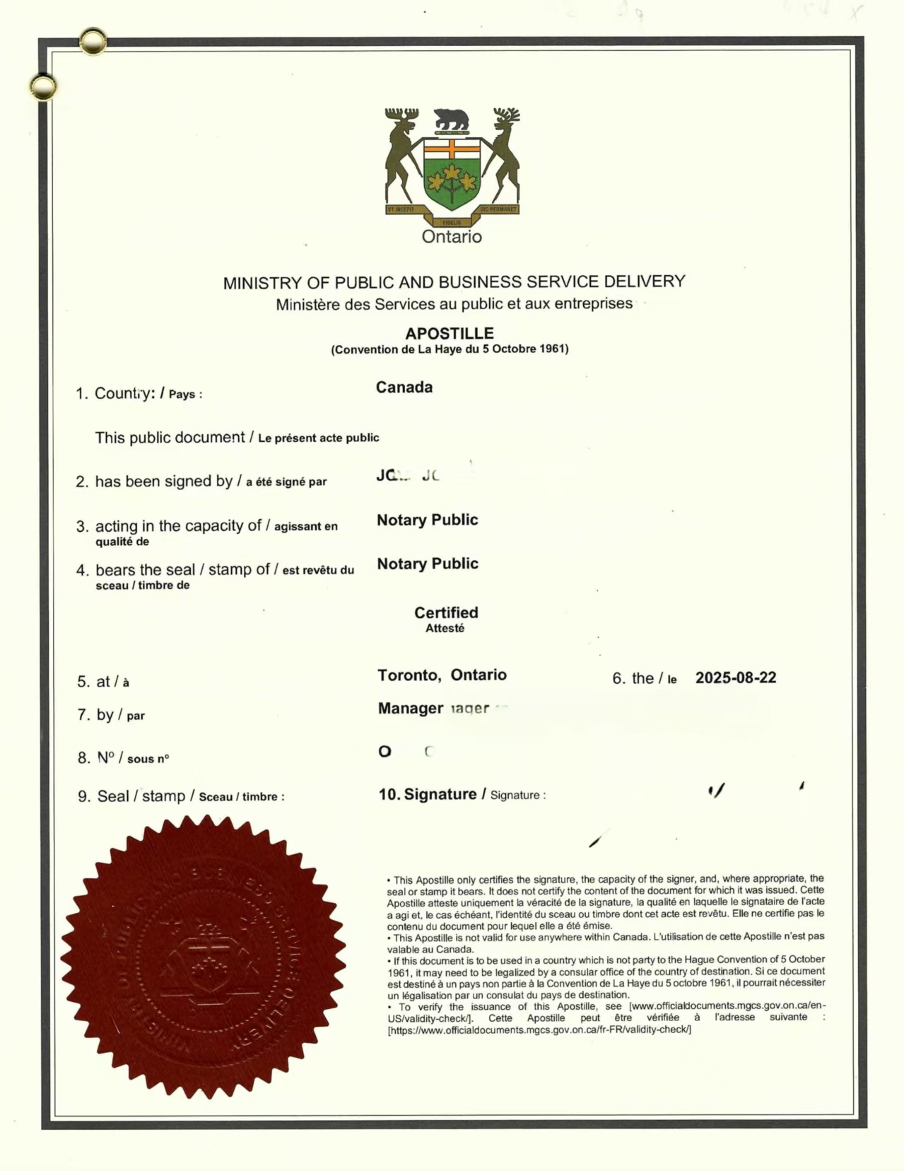 对于计划在中国长期发展或涉及跨境事务的加拿大籍华人,及时办理文件的海牙认证是必要保障。我处将继续为全球客户提供高效、合规的公证与海牙认证服务。