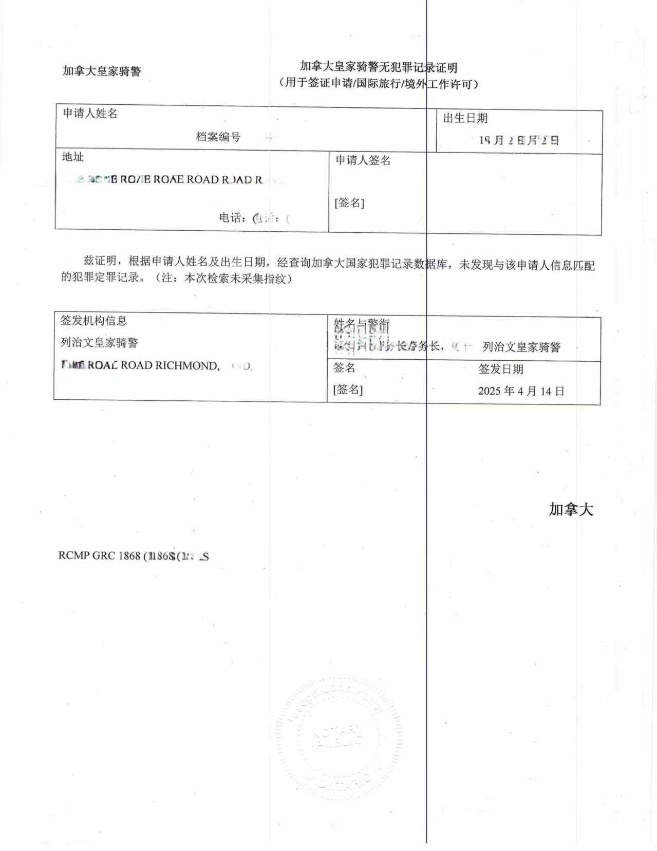 李先生首先向列治文市的加拿大皇家骑警(RCMP)申请无犯罪证明。该证明由RCMP签发,载明李先生自入籍以来未有任何刑事犯罪记录。由于文件为英文原件,无需额外翻译,但在提交至中国使用前,必须完成加拿大安省的海牙认证。