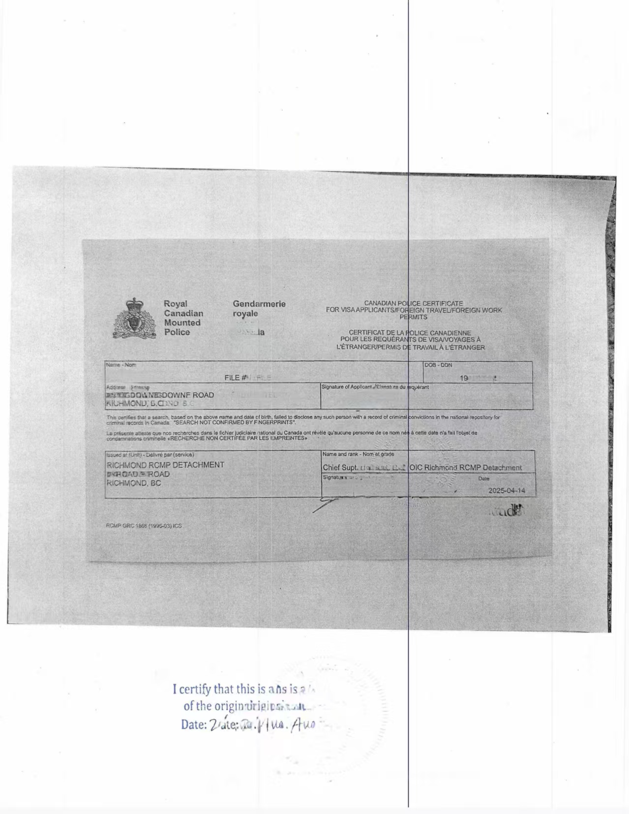 李先生原籍广东,现已加入加拿大国籍,常年居住在温哥华BC省列治文市。由于计划长期在中国北京工作生活,他需要申请中国的永久居留身份证(即“绿卡”)。中国政府要求申请人提供所在国的无犯罪记录证明,并须办理海牙认证,以确认该文件在中国具有法律效力。