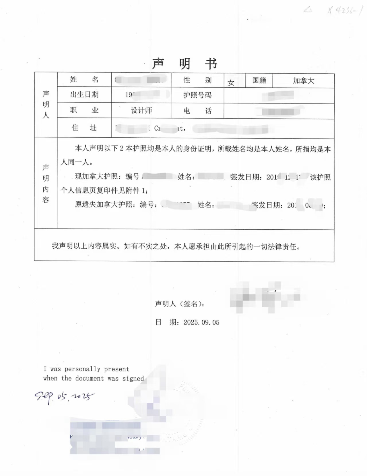 在与我们沟通后,我们建议张先生出具一份《同一人声明书》,明确写明:旧护照编号、签发日期及遗失情况,以及新护照编号、签发日期,并声明二者系同一自然人所有。声明书由我们协助撰写,保证用语符合加拿大律师公证和中国银行要求。