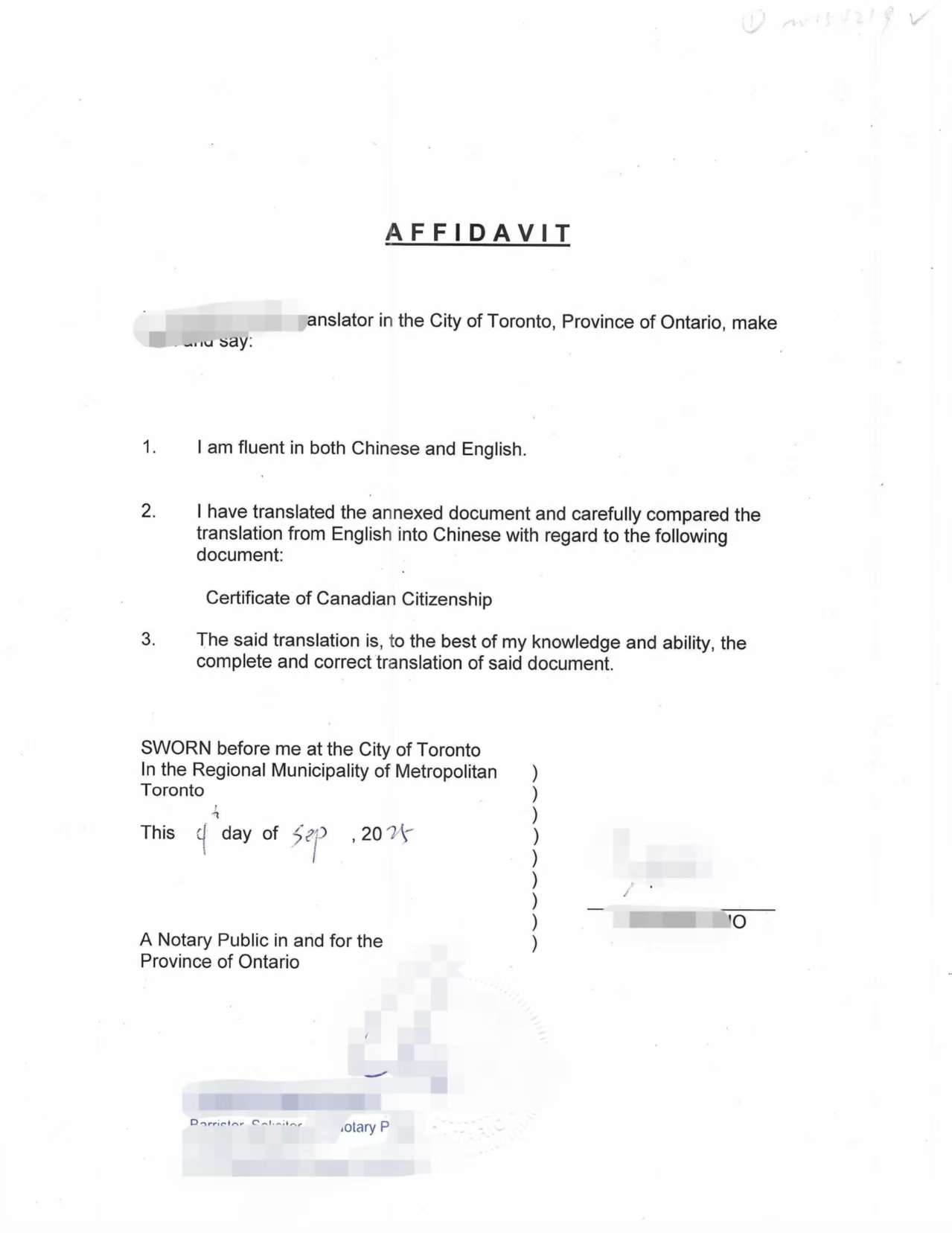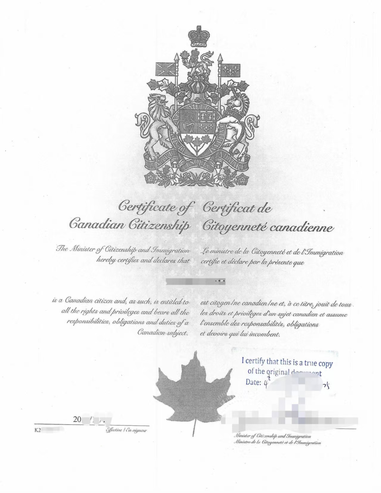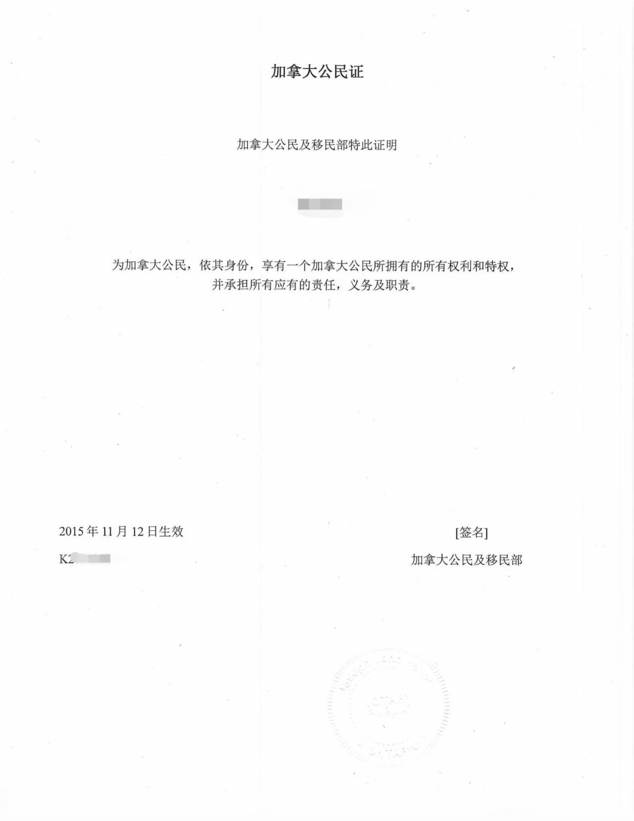 李先生早年移民加拿大,并于数年前在安省完成入籍手续,取得了加拿大公民身份。如今,他因长期在中国上海发展,计划申请中国永居身份。在整理申请材料过程中,中国有关部门要求他提供 入籍纸(Citizenship Certificate)及其入籍时间证明,并须经过 中英文翻译、律师公证以及加拿大政府海牙认证(附加证明书) 才能被认可。