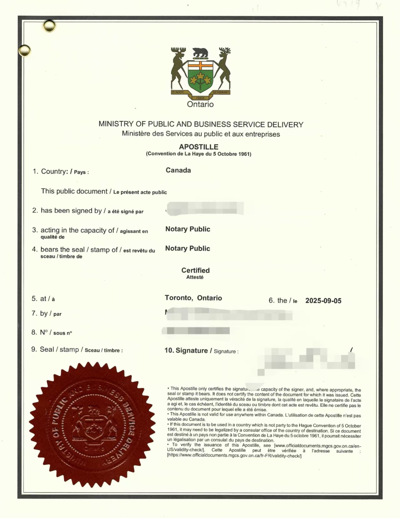 全流程包括 英译中、律师出具公证书、多伦多安省政府出具海牙认证附加证明书,最快 2个工作日完成。