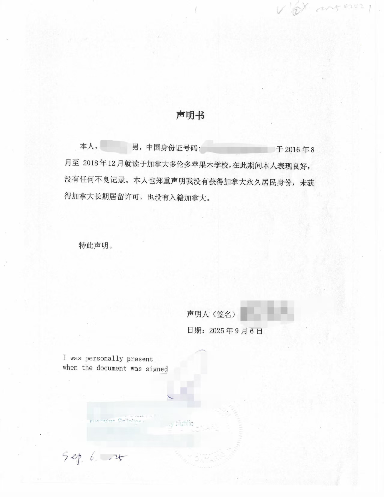 李晨本人当时身处中国,无法亲自回到加拿大办理。他通过远程方式联系了加拿大华译网公证处,并将已经签署的“未取得永居身份声明书”扫描件传送过来。文件内容简洁明了,载明: