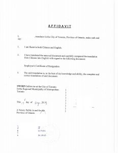 完成翻译后,我们立即安排翻译员进行了翻译宣誓(Affidavit of Translation),由持牌加拿大律师在多伦多现场见证签署,确保整个流程合规、严谨。该宣誓书及翻译件一同附在最终公证材料中,满足加拿大移民局文件认证的全部要求。