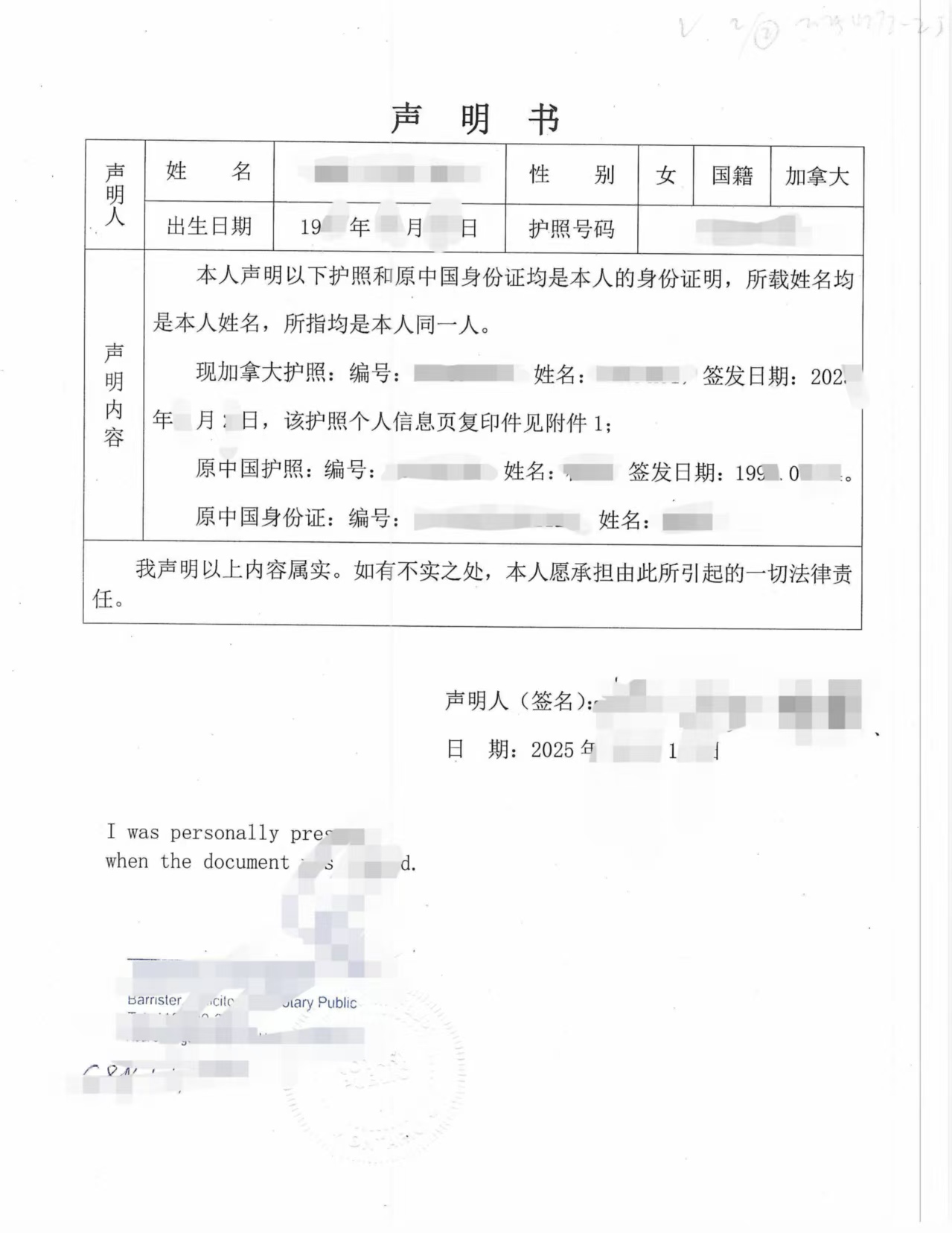 加拿大同一人声明书海牙认证(护照+原中国护照+中国身份证)