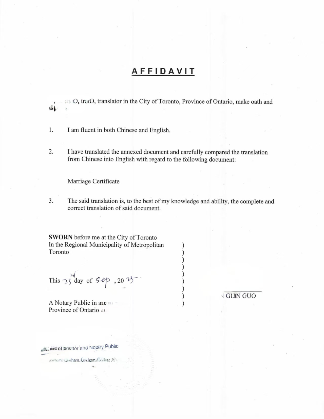 在翻译完成后,译者依照加拿大相关法律规定进行了宣誓,声明翻译内容准确、完整。随后,我们的合作公证律师出具了翻译公证书,以保证该文件能够在北美的移民及签证申请中获得官方认可。