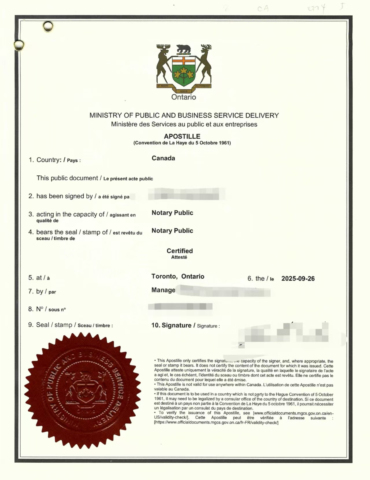 如您也有类似文件需要办理海牙认证、公证、翻译等服务,欢迎联系加拿大华译网公证处,我们可为全球客户提供远程服务,一站式解决认证难题。