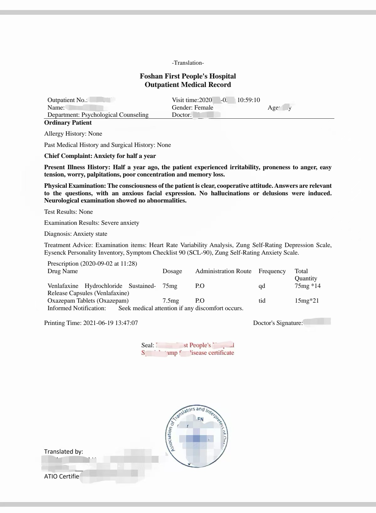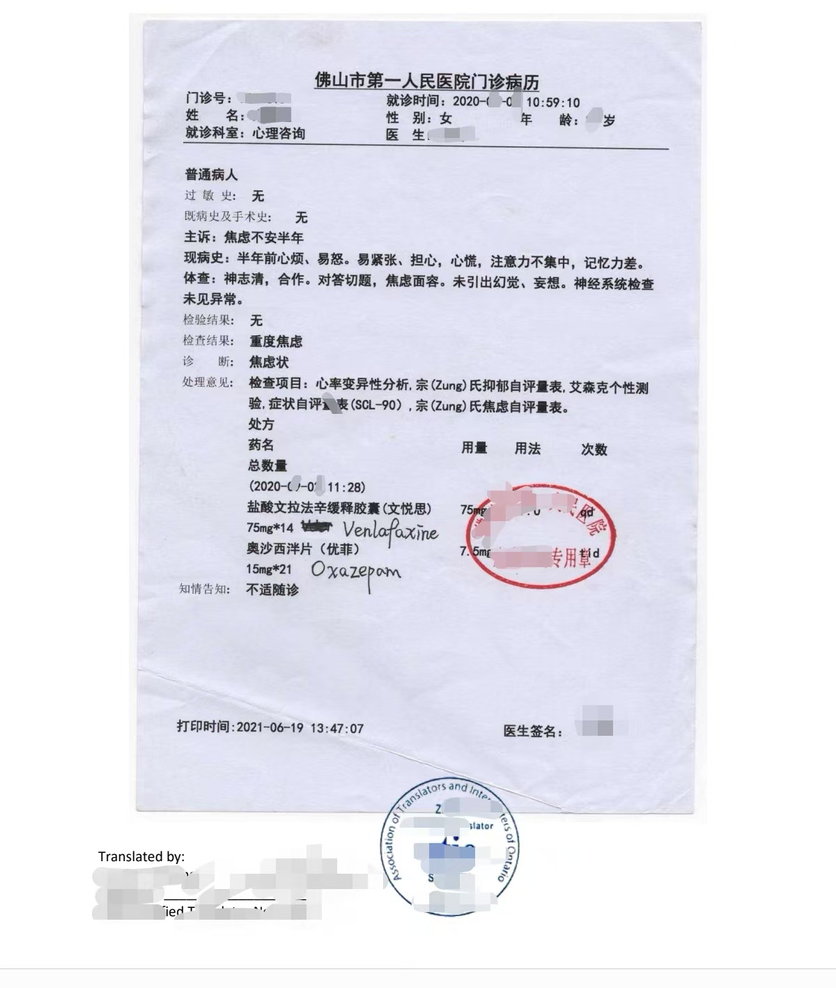 该处方由中国广东佛山市人民医院出具,内容包括病人诊断、所开药物(用于治疗焦虑抑郁症状)及医生签章。客户通过微信联系到我们,表示需要获得安省ATIO持牌翻译员进行翻译,同时还需满足移民局对于法庭证据的翻译认证要求。我们随即启动了加急翻译流程。