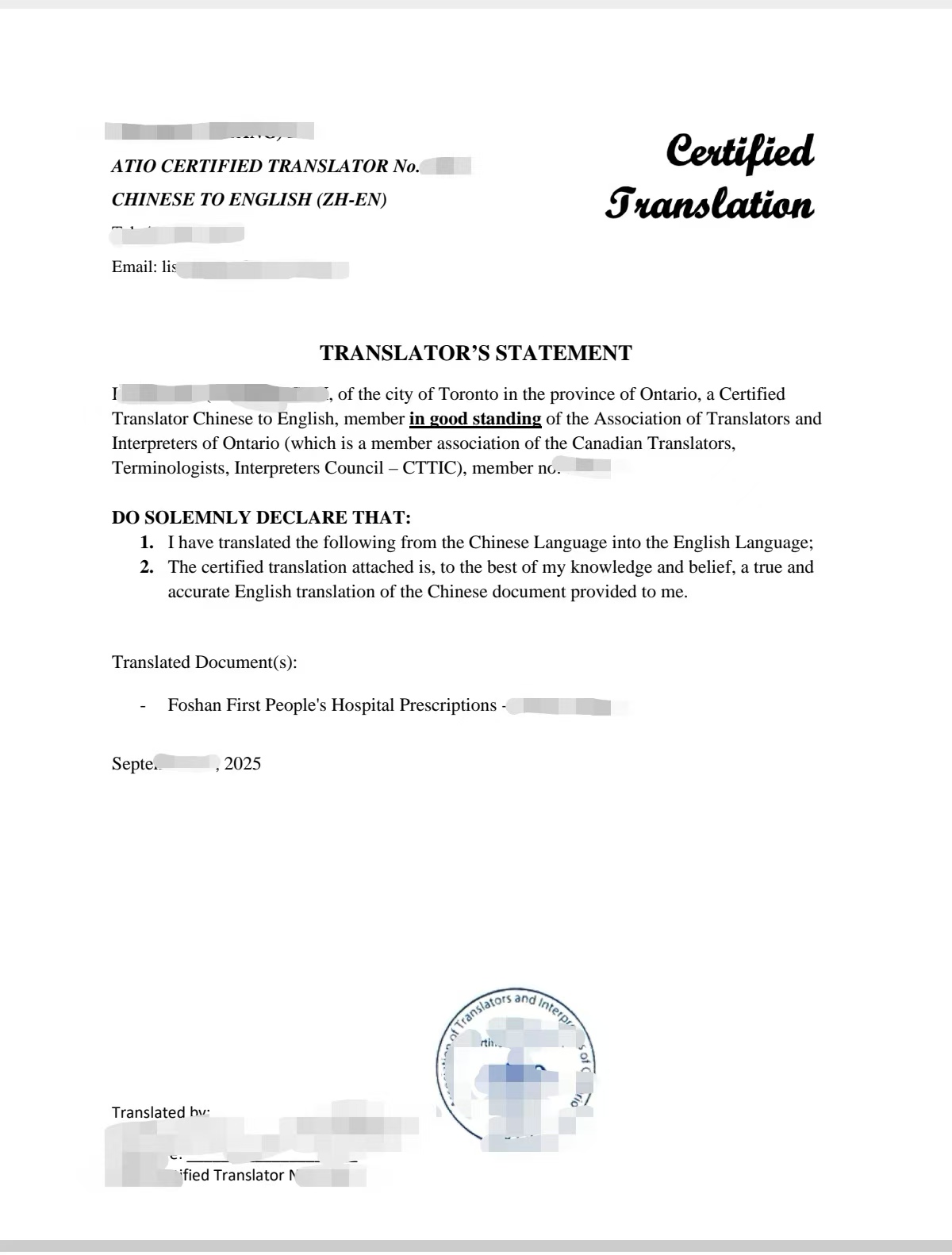 ATIO认证翻译:我们安排安省持牌的ATIO成员翻译员对该医疗处方进行精准中译英处理,确保术语准确、格式规范,满足法律要求。