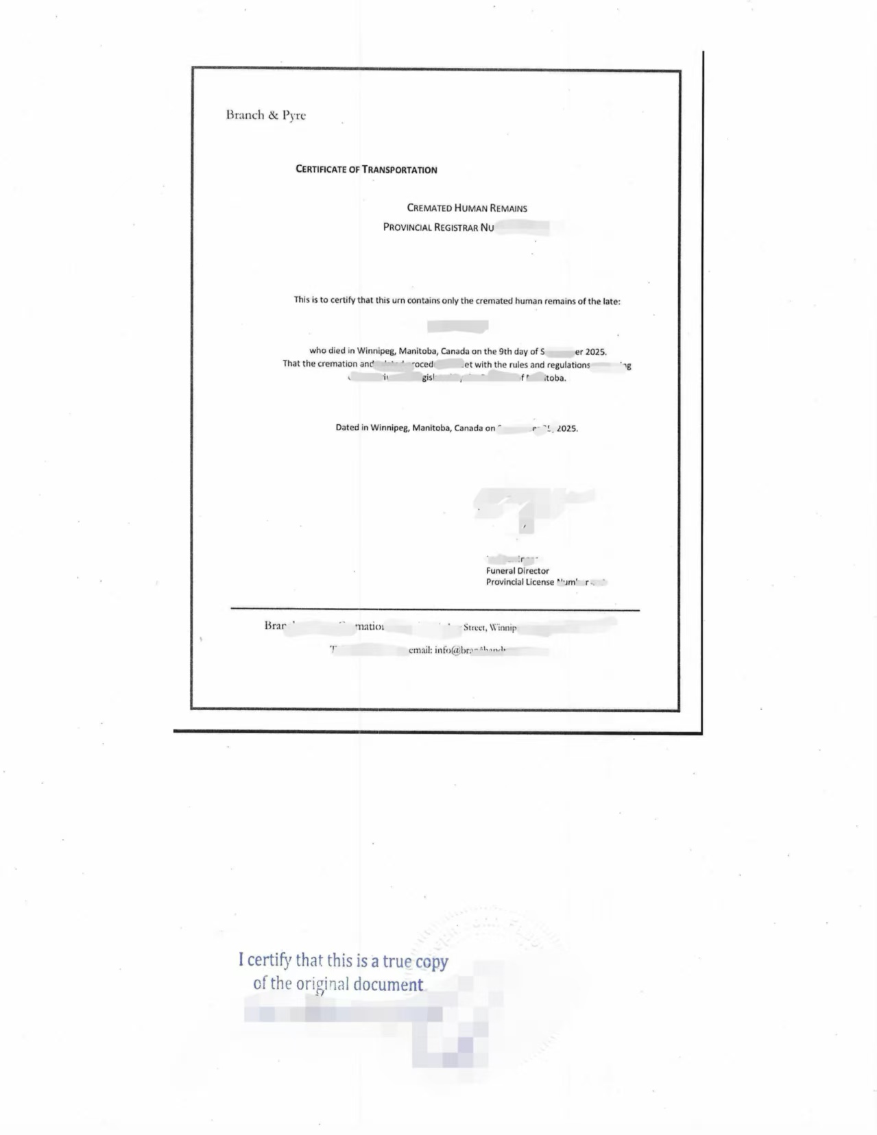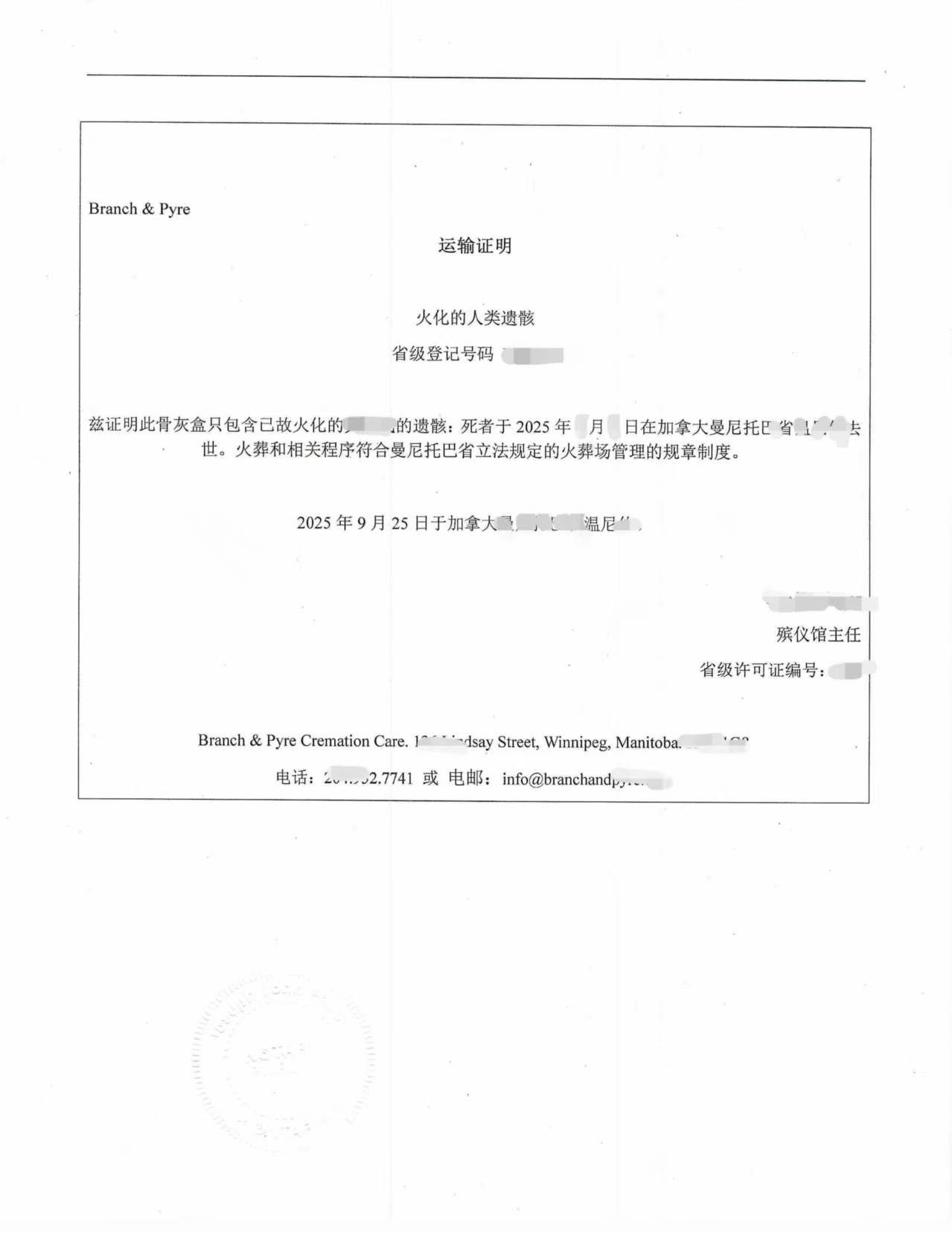 在2025年9月,一位居住在中国吉林的客户急需使用一份曼尼托巴省签发的骨灰运输证明,以便在国内民政及相关部门办理遗体火化后安葬和遗产继承等后续手续。由于文件签发地在加拿大曼省,但客户本人不在加拿大,因此选择远程委托多伦多华译网公证处完成文件的翻译、公证及海牙认证。