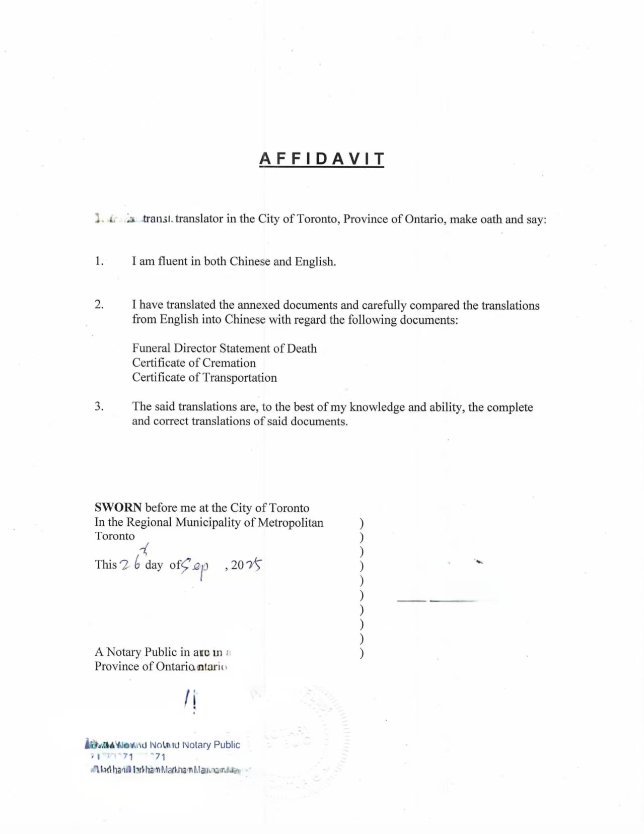 包括英译中骨灰运输证明,律师公证员公证、安省政府海牙认证,远程跨省办理,中国认可,时间2天,只需要发来骨灰运输证明电子版,办理完成后快递到中国吉林