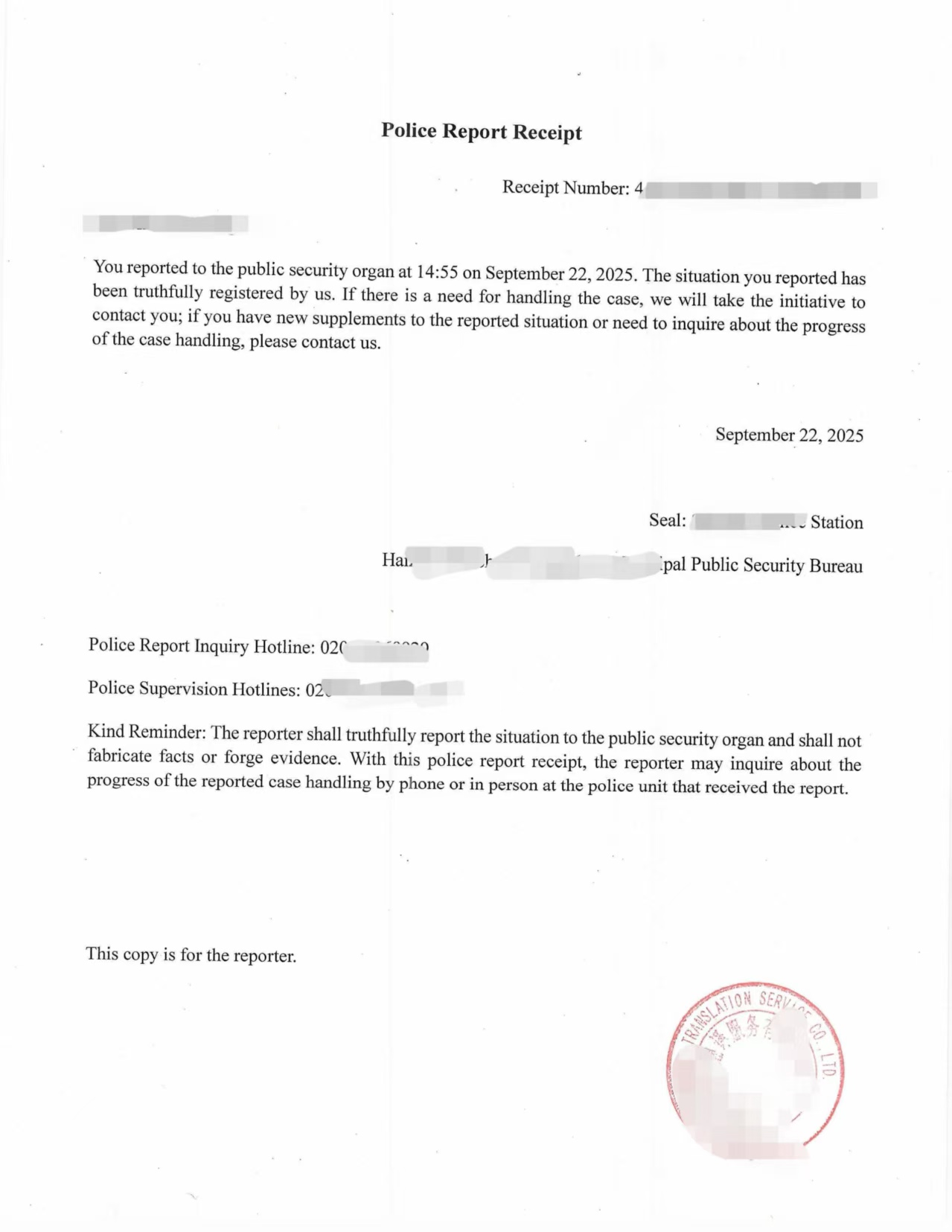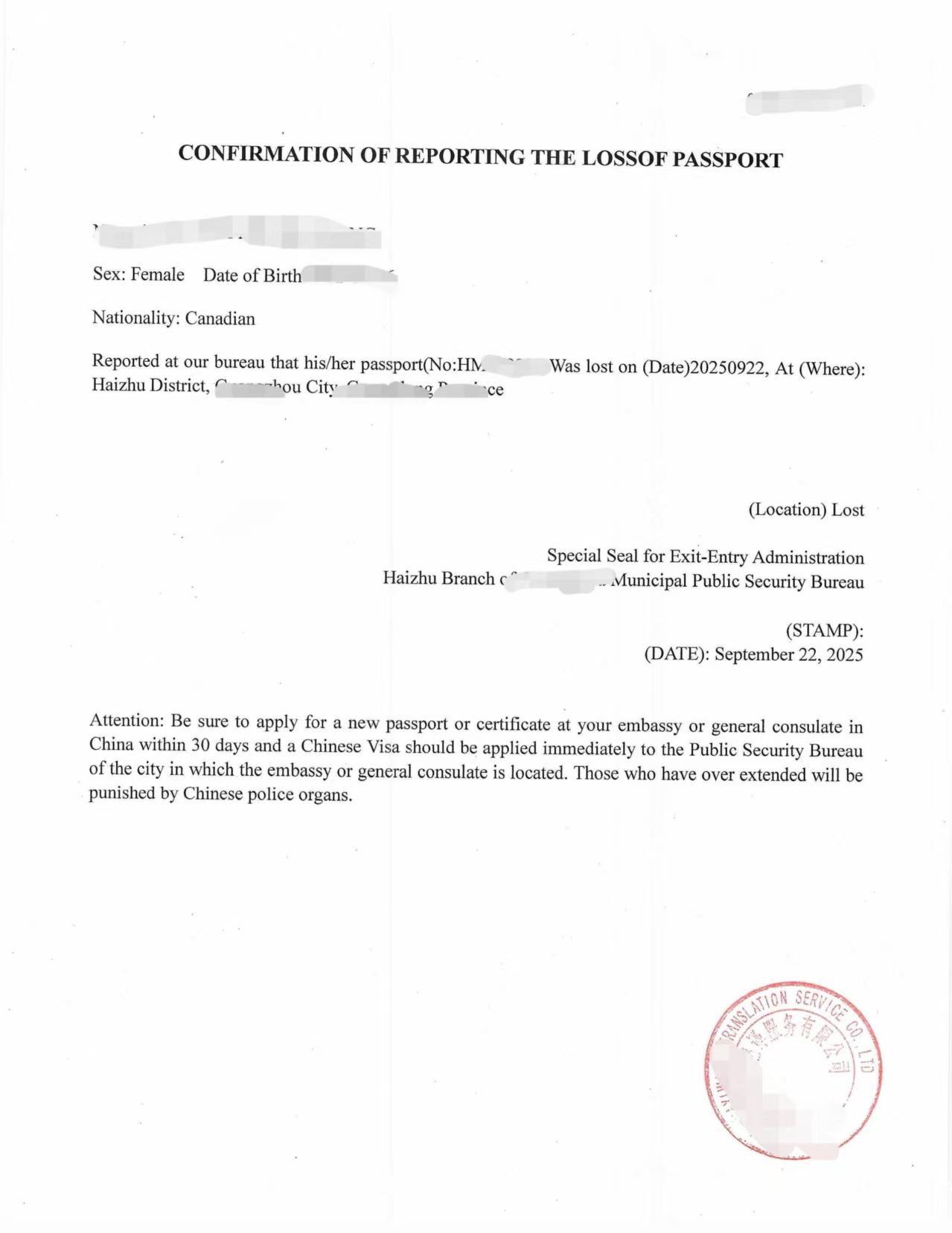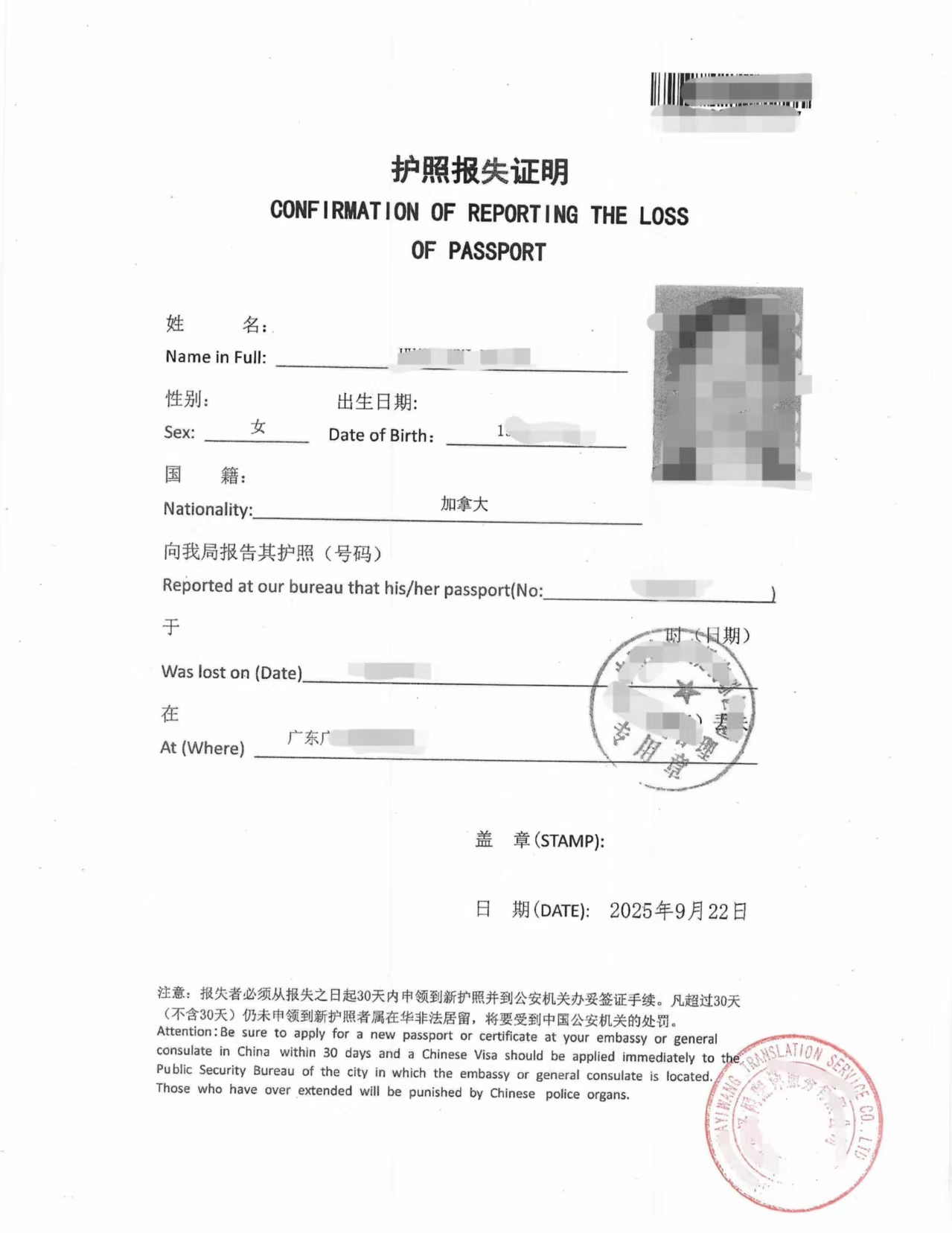 本案例中,当事人通过 公安报失证明+报警回执 的官方文件,配合 专业翻译公司中译英并加盖公章、附营业执照,满足了加拿大驻华使领馆对证明文件的要求,顺利推进退籍证明申请流程。