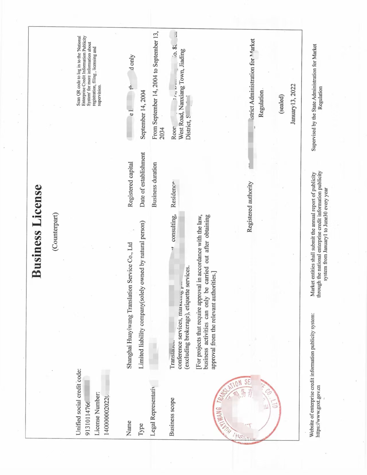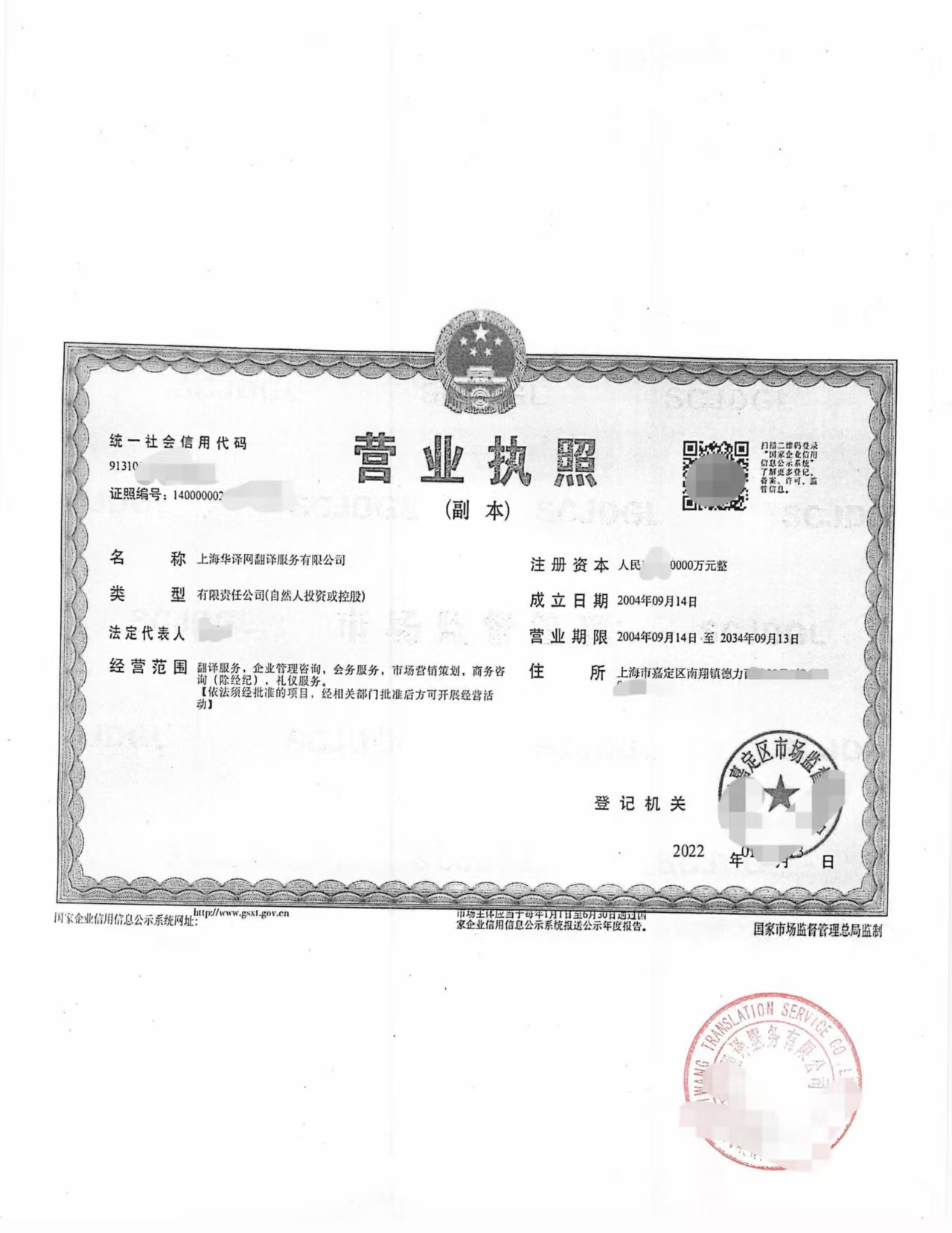 附上翻译公司营业执照复印件并加盖公章,作为翻译资质证明。
