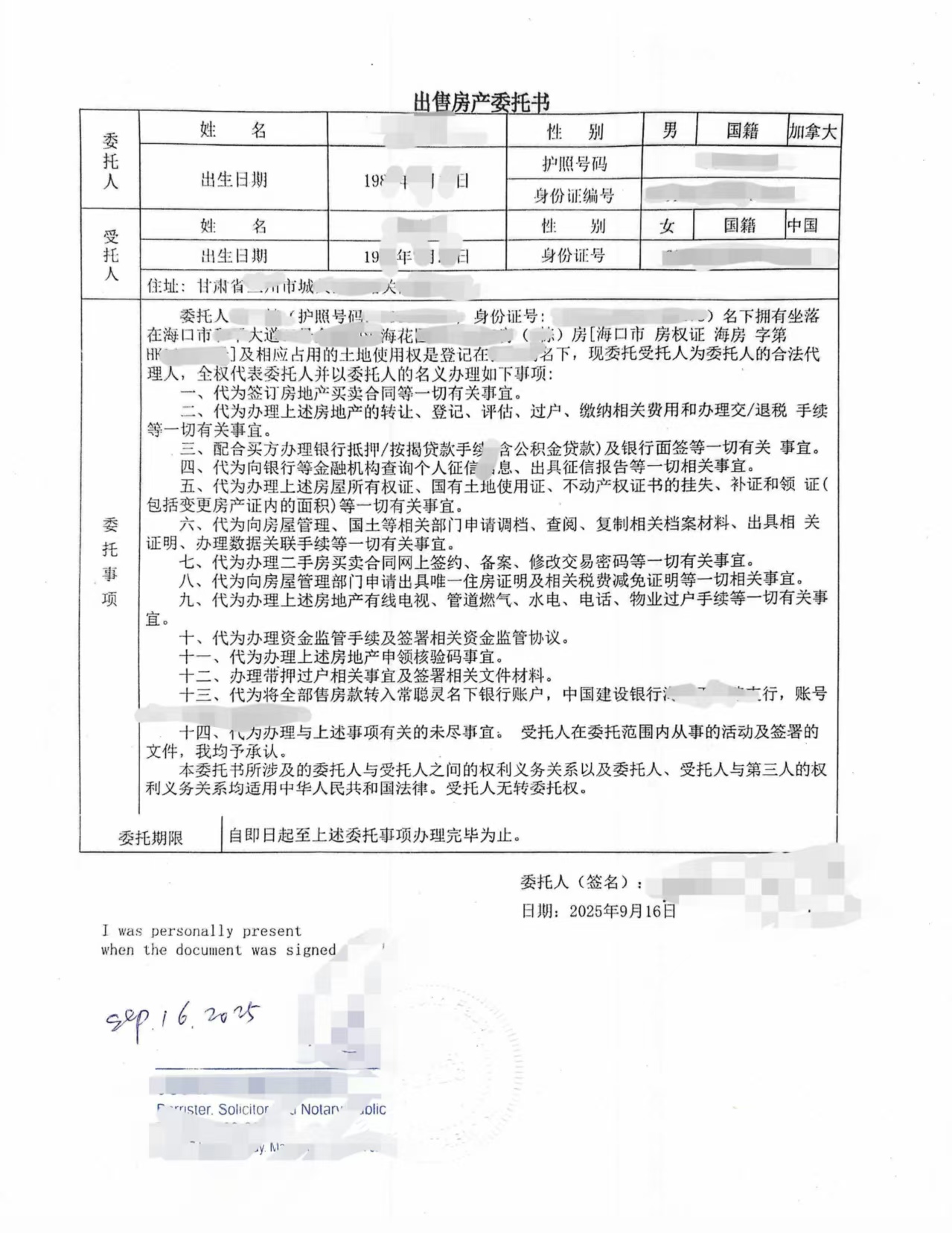 本案例中,加拿大籍人士虽身处德国,但通过远程方式,将 电子签名的售房委托书 提交至华医网加拿大公证处,仅用 2 个工作日 即完成公证及海牙认证。认证文件随即快递至中国海口,由受托代理人提交给相关部门,确保房产出售过程合规合法、顺利完成。