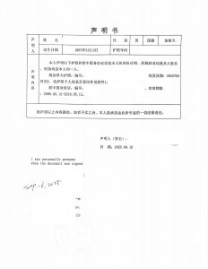 当事人首先准备并签署一份《同一人声明书》,声明加拿大护照与中国身份证系同一人所有。