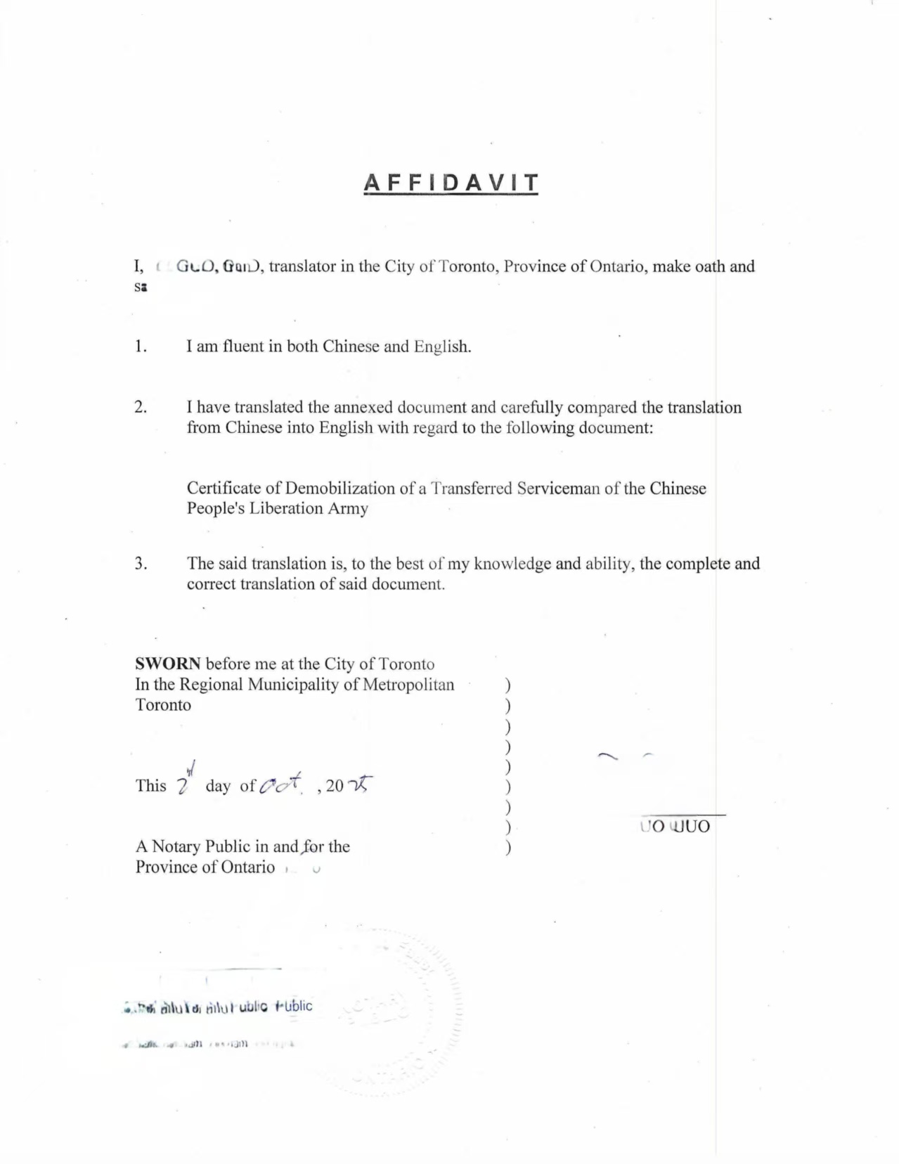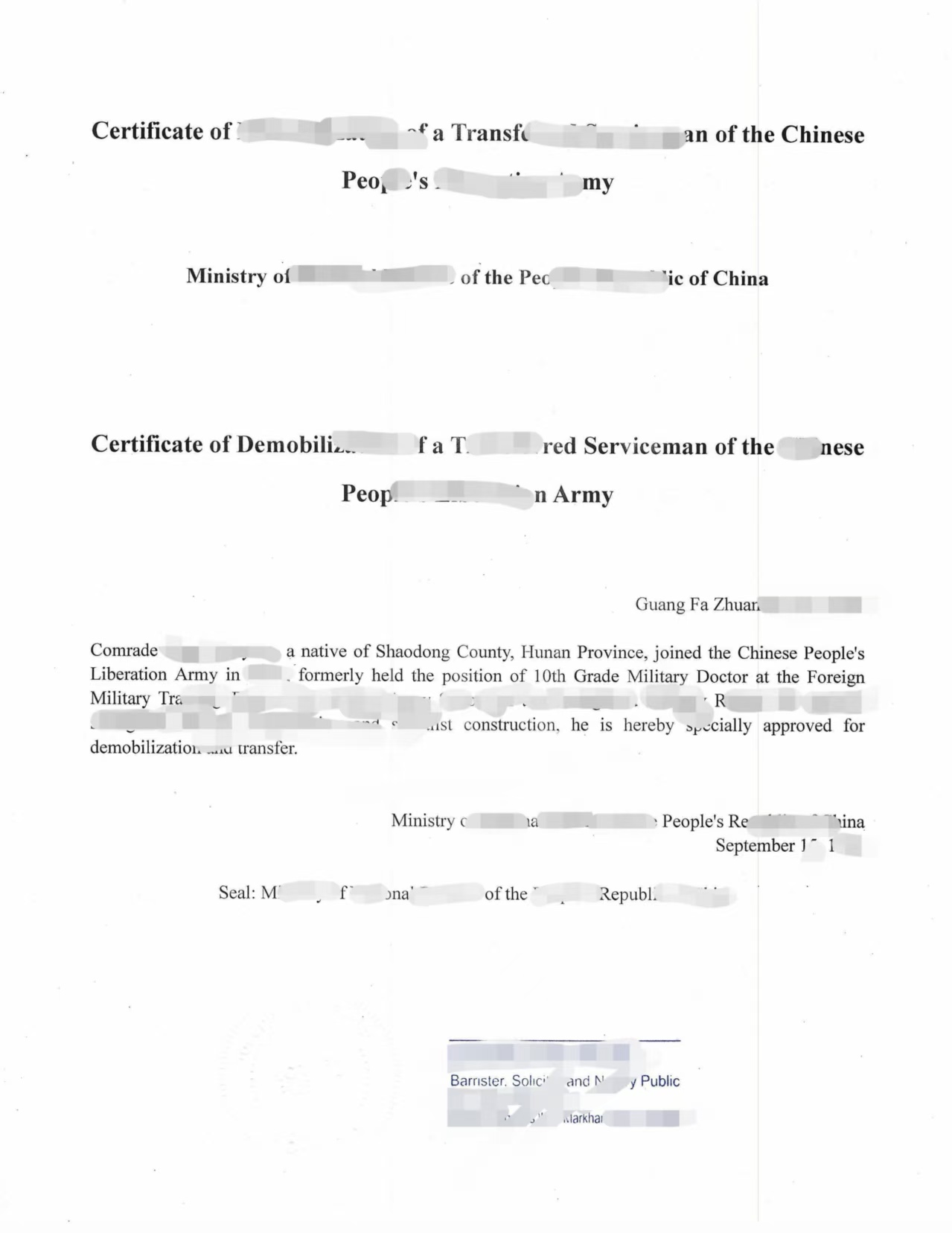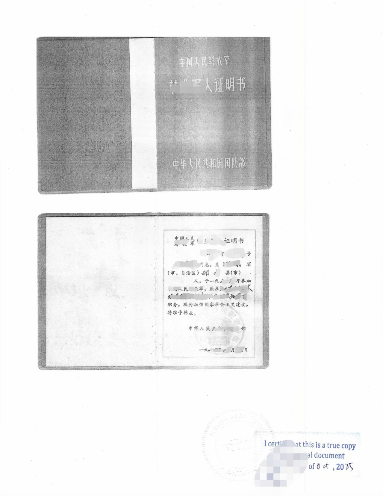 李先生与周女士(化名)是一对来自中国的夫妻,两人均曾在中国人民解放军服役,退役后获得了正式的 转业军人证明书。夫妻二人决定申请加拿大移民,提交材料过程中,加拿大移民局(IRCC)要求他们提供完整的服役与转业记录,以作为背景调查与身份核实的重要依据。由于原始文件为中文,必须提供 经认证译员翻译并公证的英文版本,方可在加拿大移民局获得认可。
