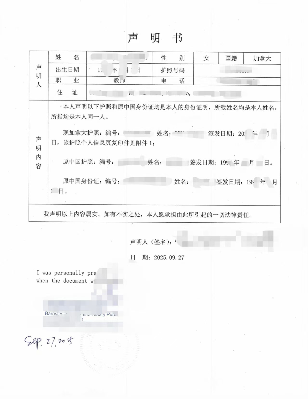 声明书主要内容:确认其加拿大护照身份与中国身份证、户籍身份系同一人。