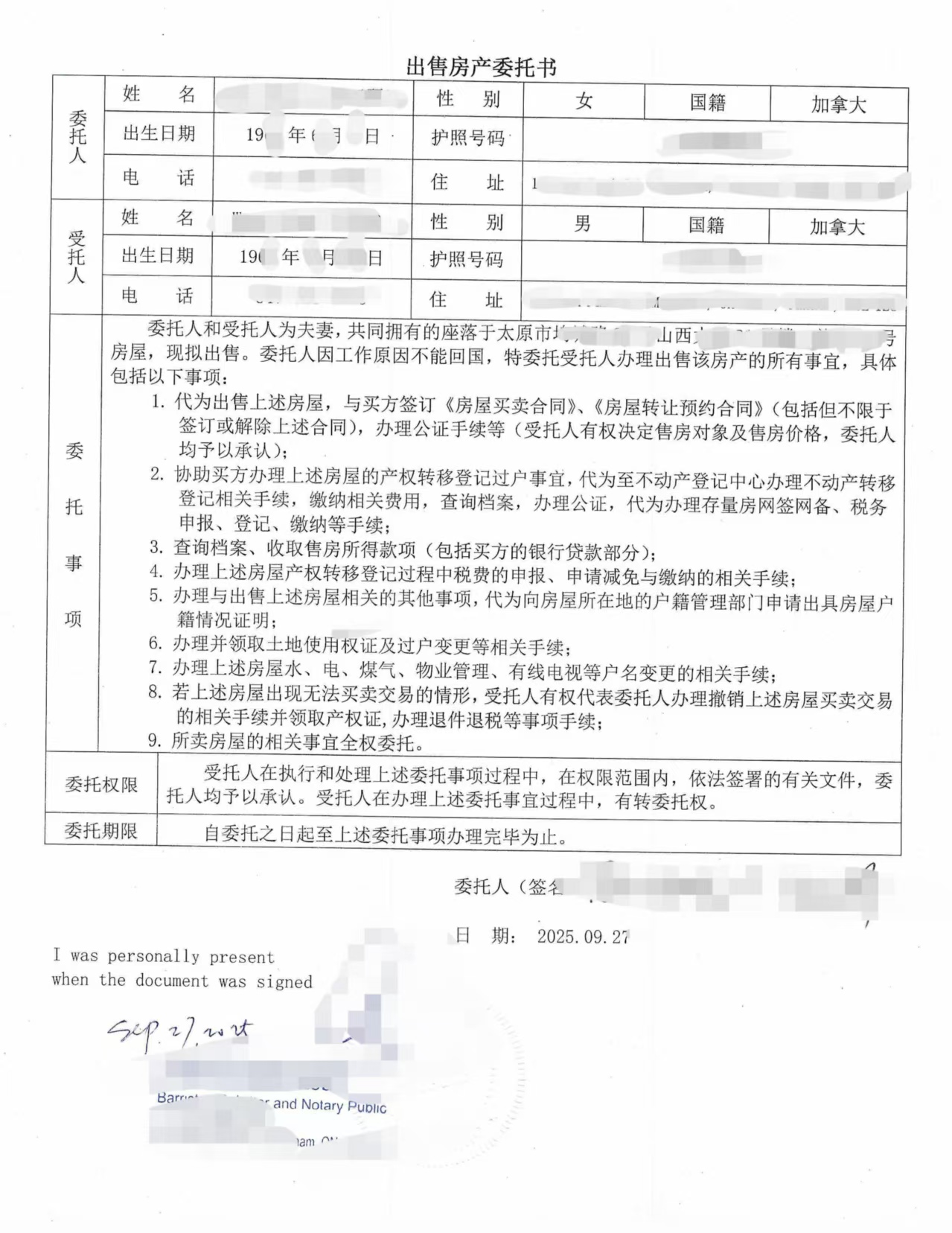 张先生在意大利签署《售房委托书》,内容明确授权其在山西的代理人全权处理房产过户手续。