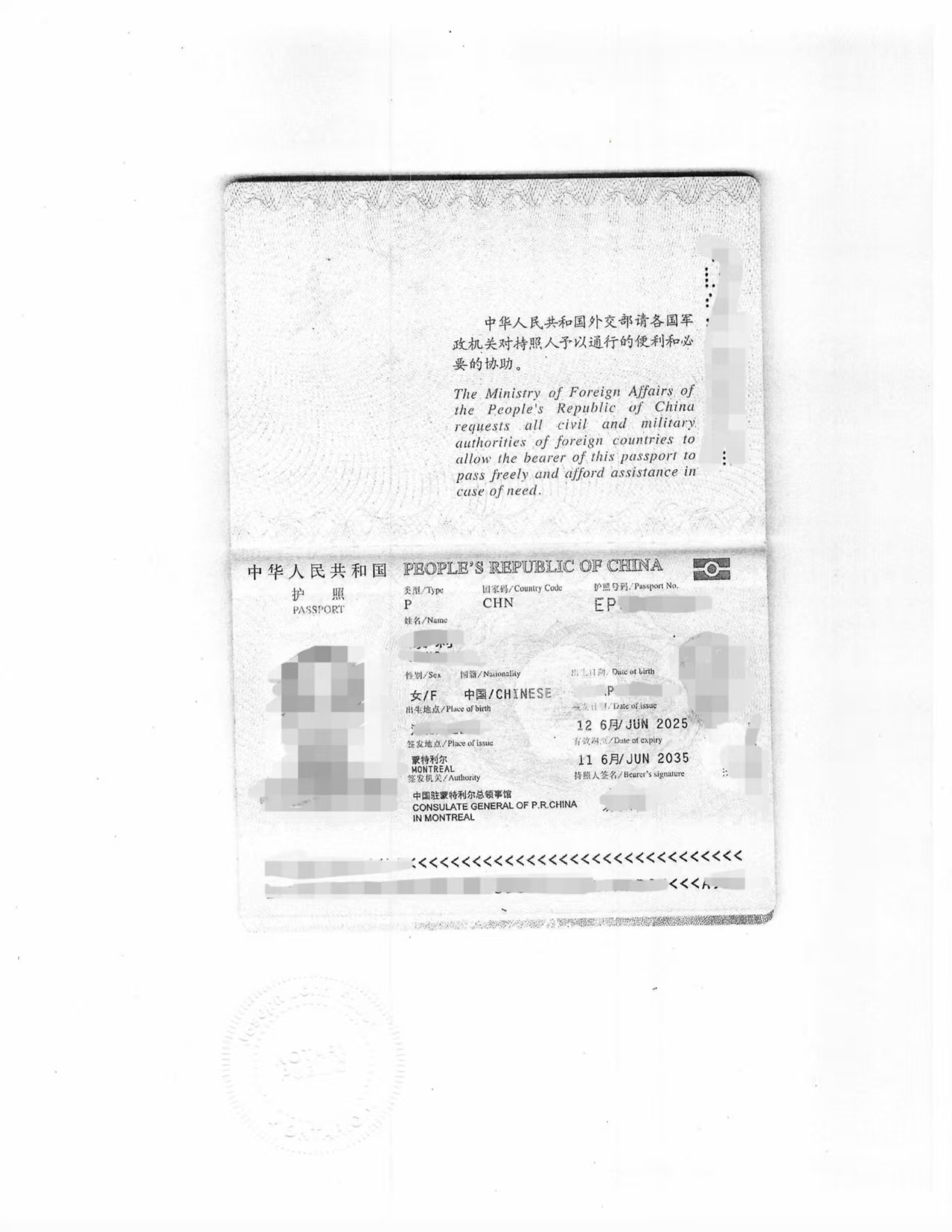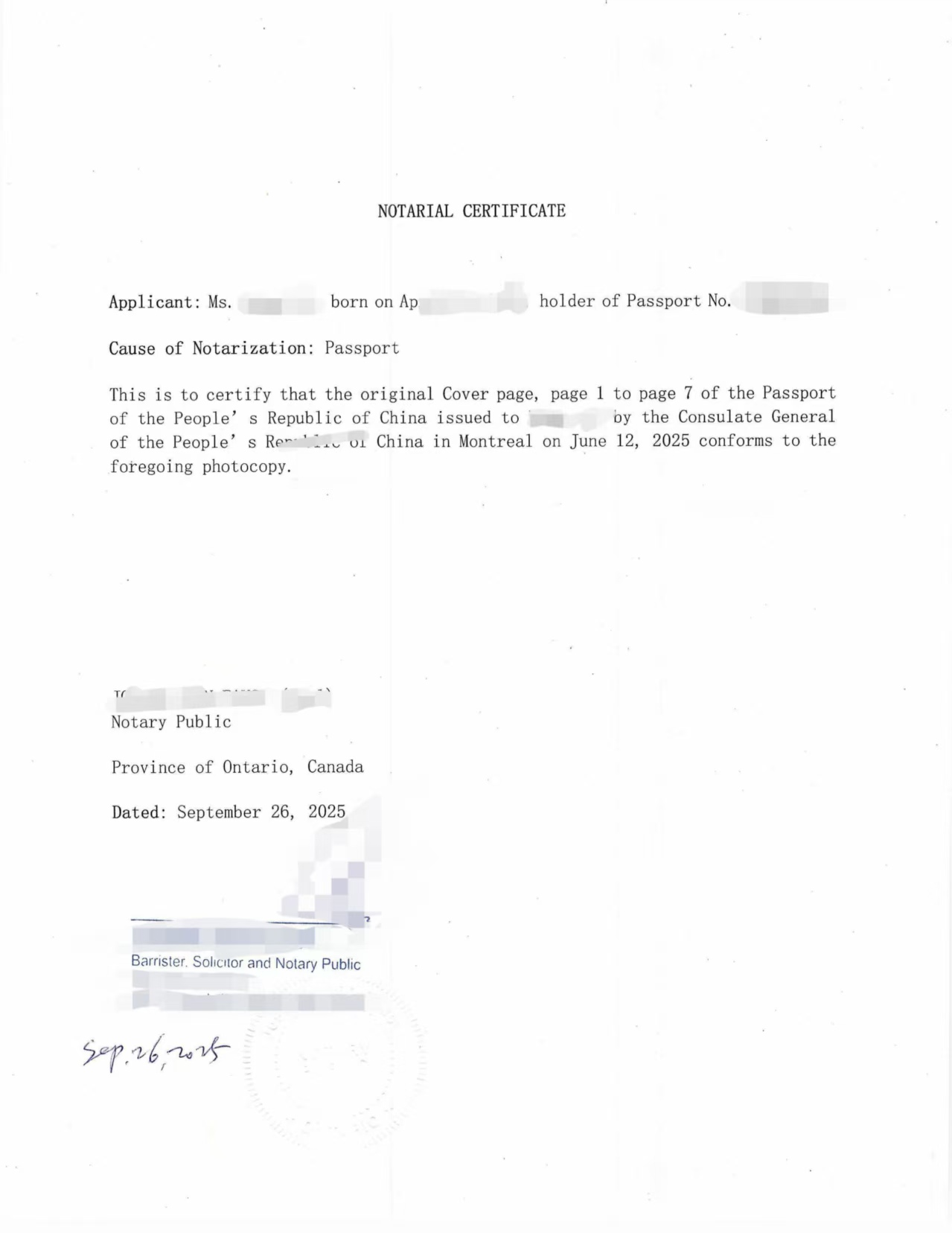 她携带中国护照原件至多伦多的公证处,由公证员当场核验,并制作护照首页至签证页的复印件。
