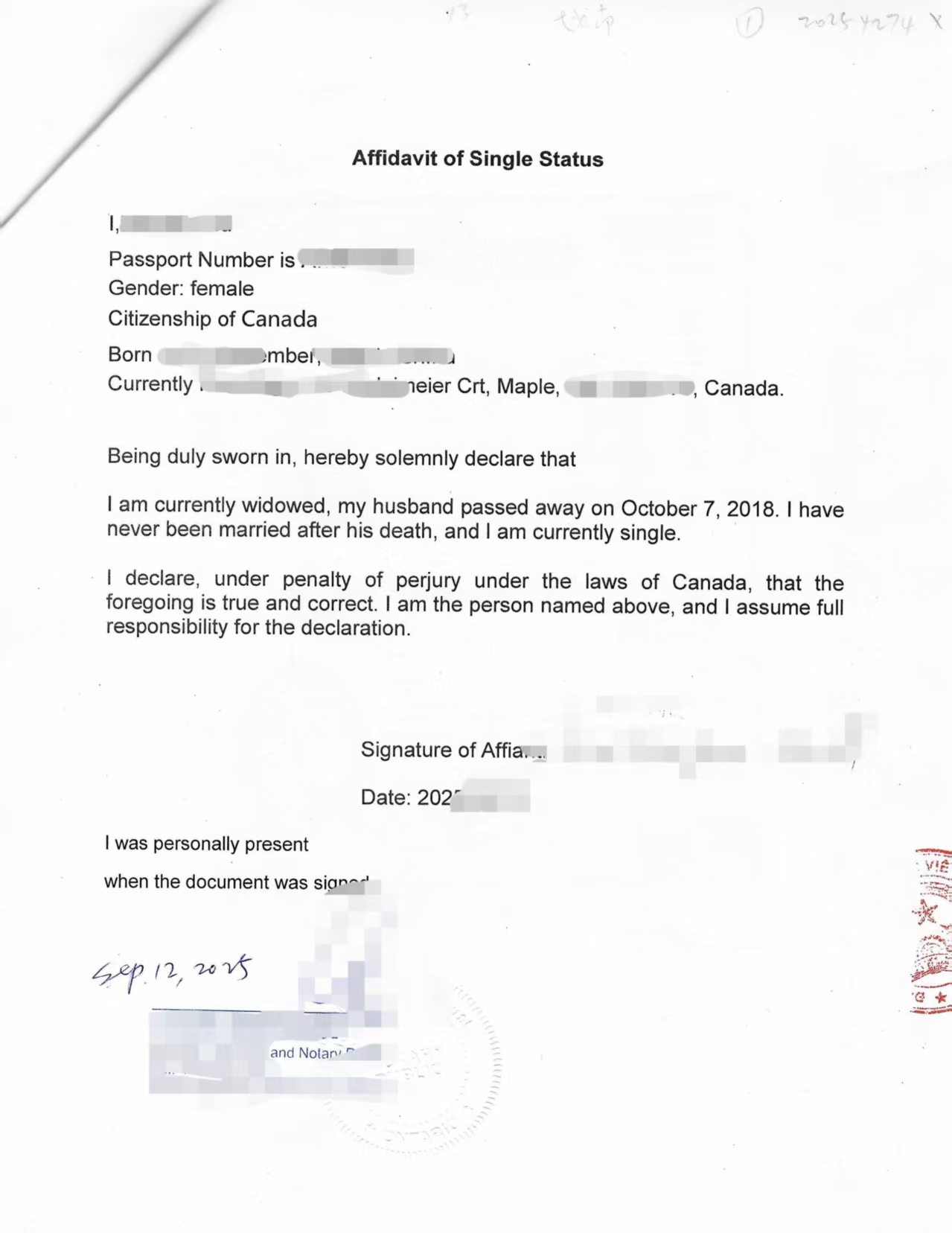 当事人 王明(化名),男,加拿大国籍,现居住于加拿大安大略省。因其在越南的直系亲属去世,需要办理遗产继承手续。根据越南相关法律规定,继承手续要求申请人提供经所在国公证并经越南驻外使领馆认证的 单身声明书,以确认申请人在办理继承时的婚姻状况。
