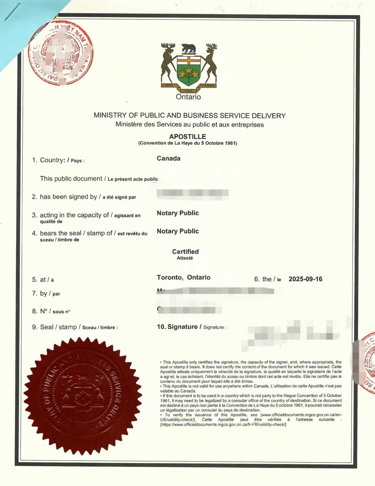 律师出具的单身声明书经 安省公证员(Notary Public) 盖章确认,并进一步送至 安省省政府认证处(Official Documents Services, Ontario)进行省一级认证,以证明公证员签字与印章的合法性。