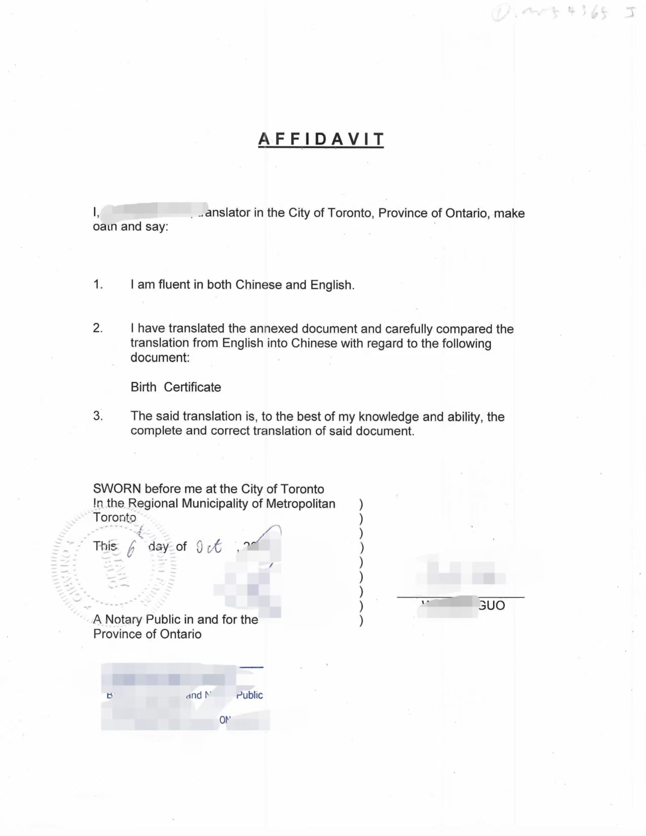 公证处首先对阿省出生证进行了专业的中文翻译,并在翻译件中将孩子姓名标注为 “中文姓名(英文姓名)” 的对照格式。
