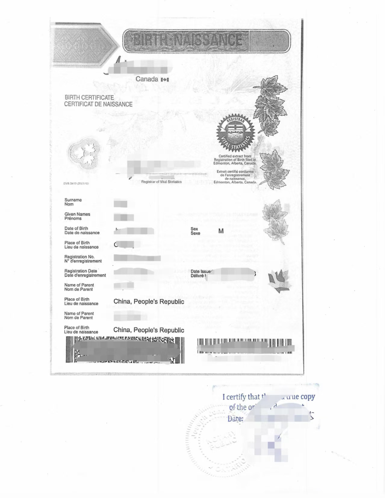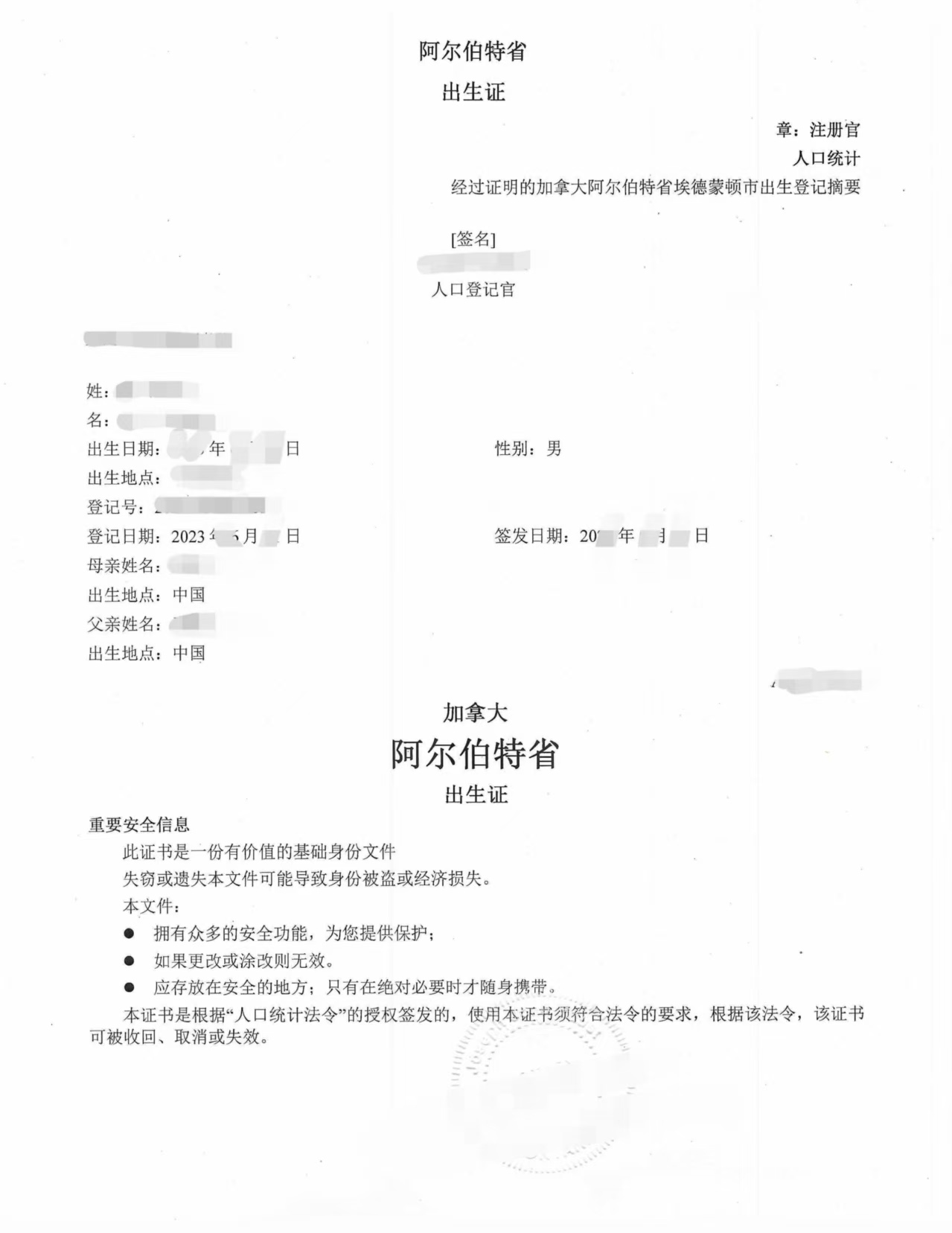 虽然文件签发地在阿尔伯塔省,但由于加拿大的海牙认证可在联邦及指定机构统一办理,本案例由 多伦多公证处 远程操作完成,认证结果在 中国境内获得认可,可正常用于孩子的身份登记及其他相关手续。