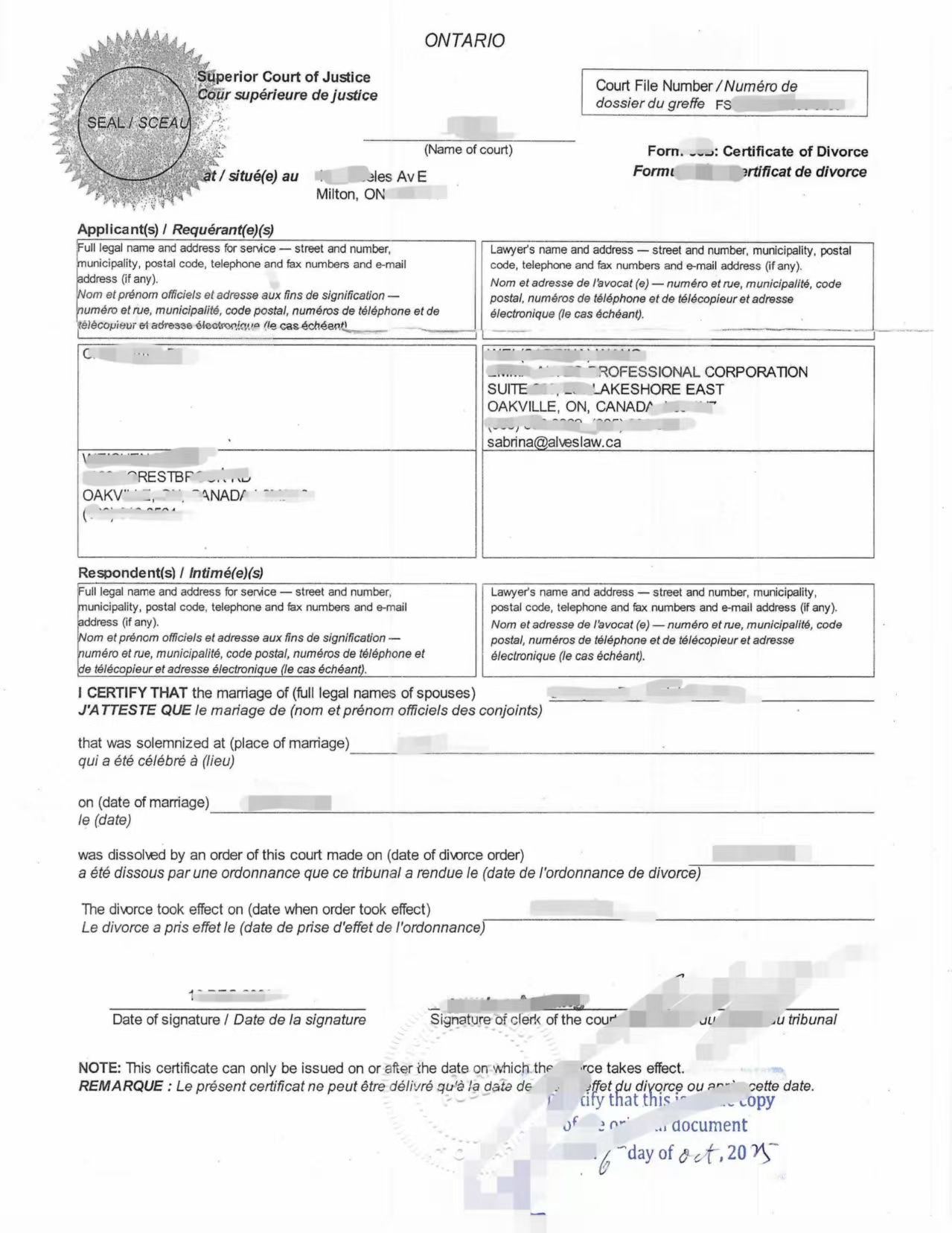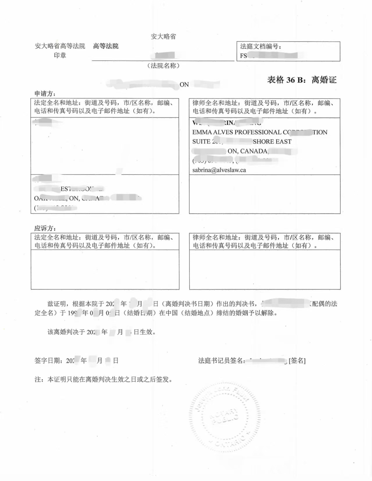 婚姻状况:双方在加拿大完成离婚登记,已由加拿大法院或民事登记机构颁发正式离婚证(Certificate of Divorce)。
