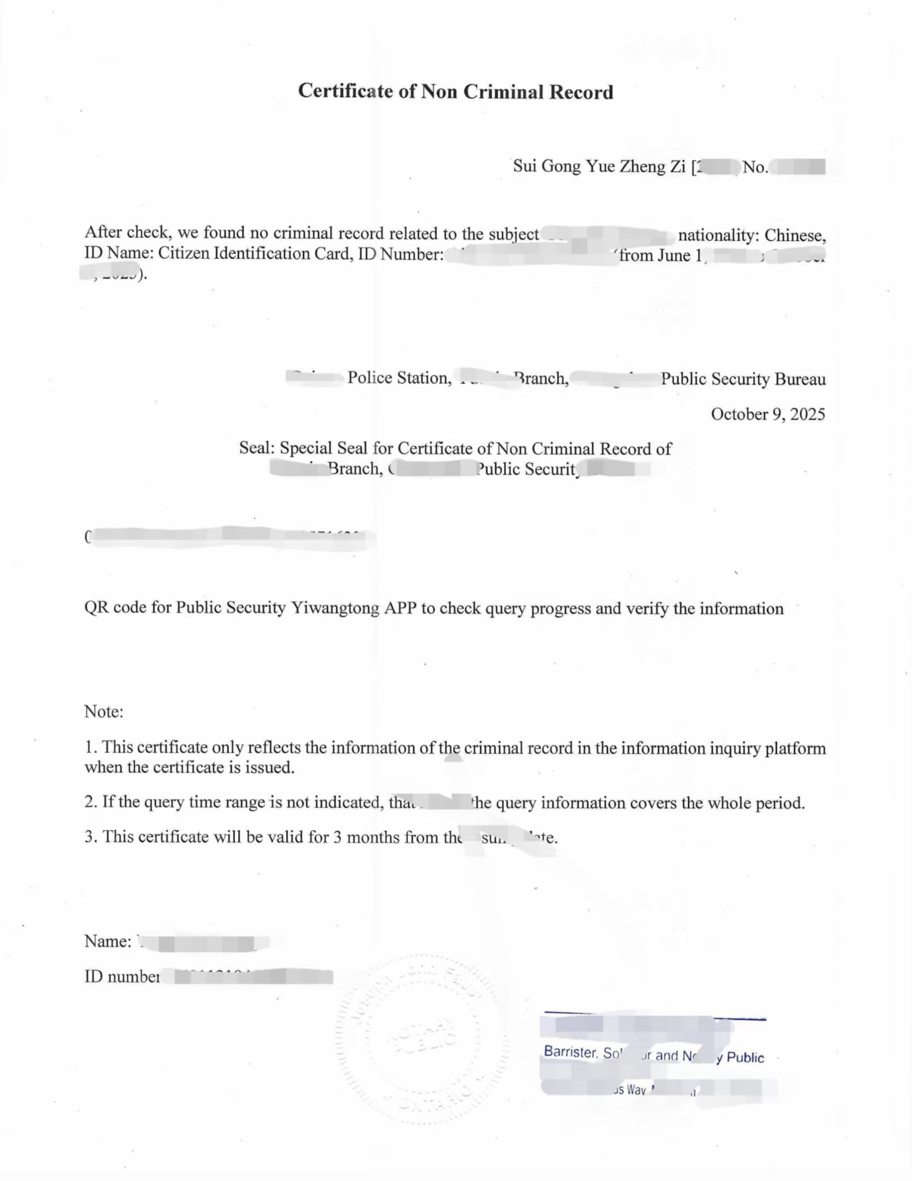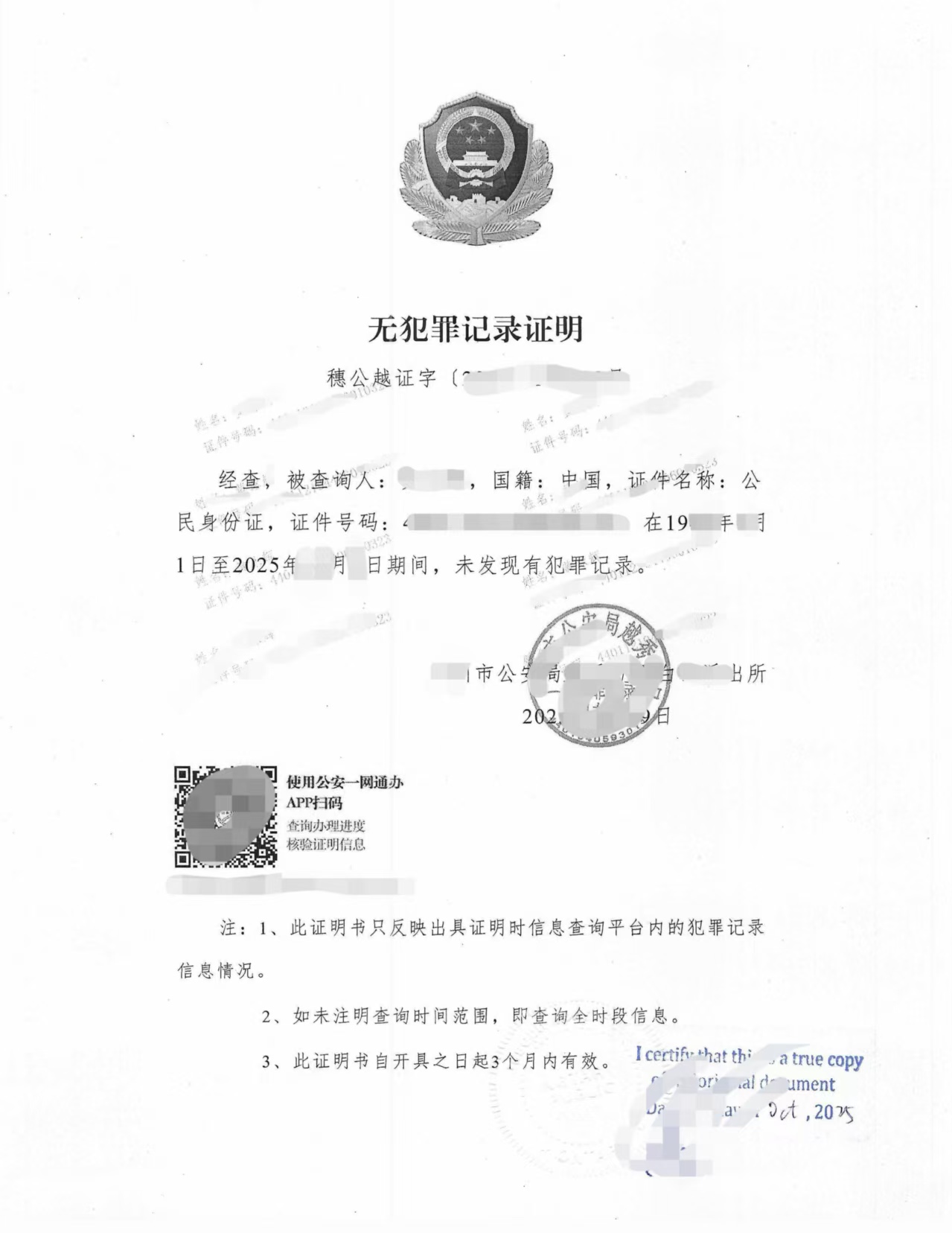李女士现居加拿大温哥华,近期申请加拿大国籍(Citizenship Application),根据加拿大移民局(IRCC)的要求,须提供本人在中国居住期间的无犯罪记录证明(No Criminal Record Certificate)。她早年户籍所在地为广州市越秀区白云派出所,遂委托国内亲友代为开具证明,并将扫描件通过电子邮件发送至加拿大华译网华人公证处。