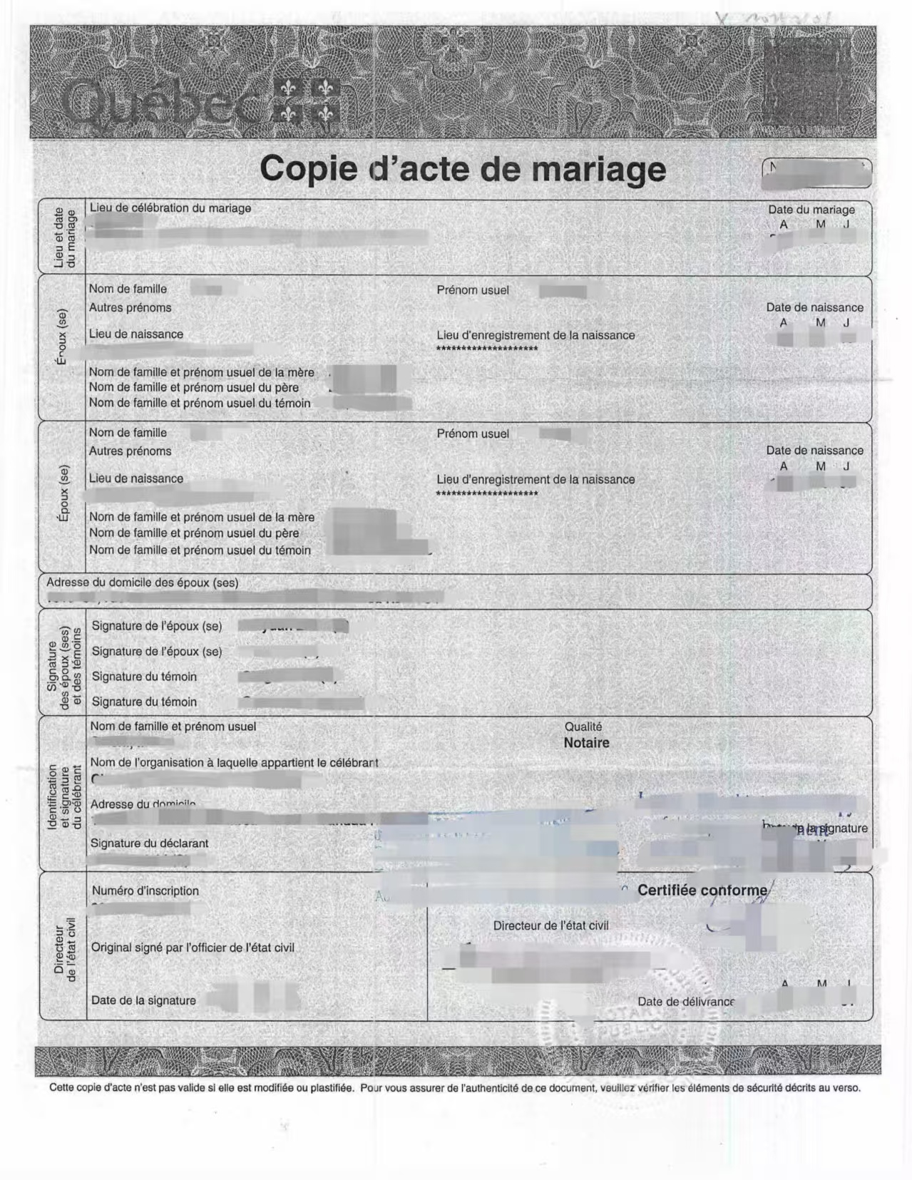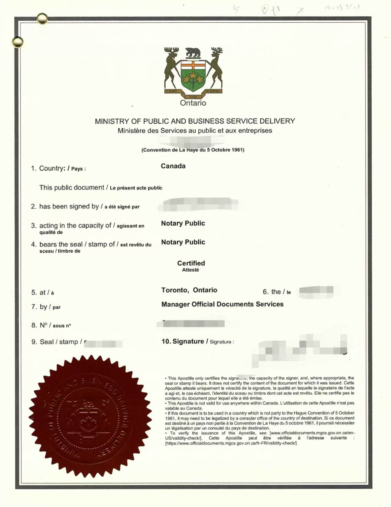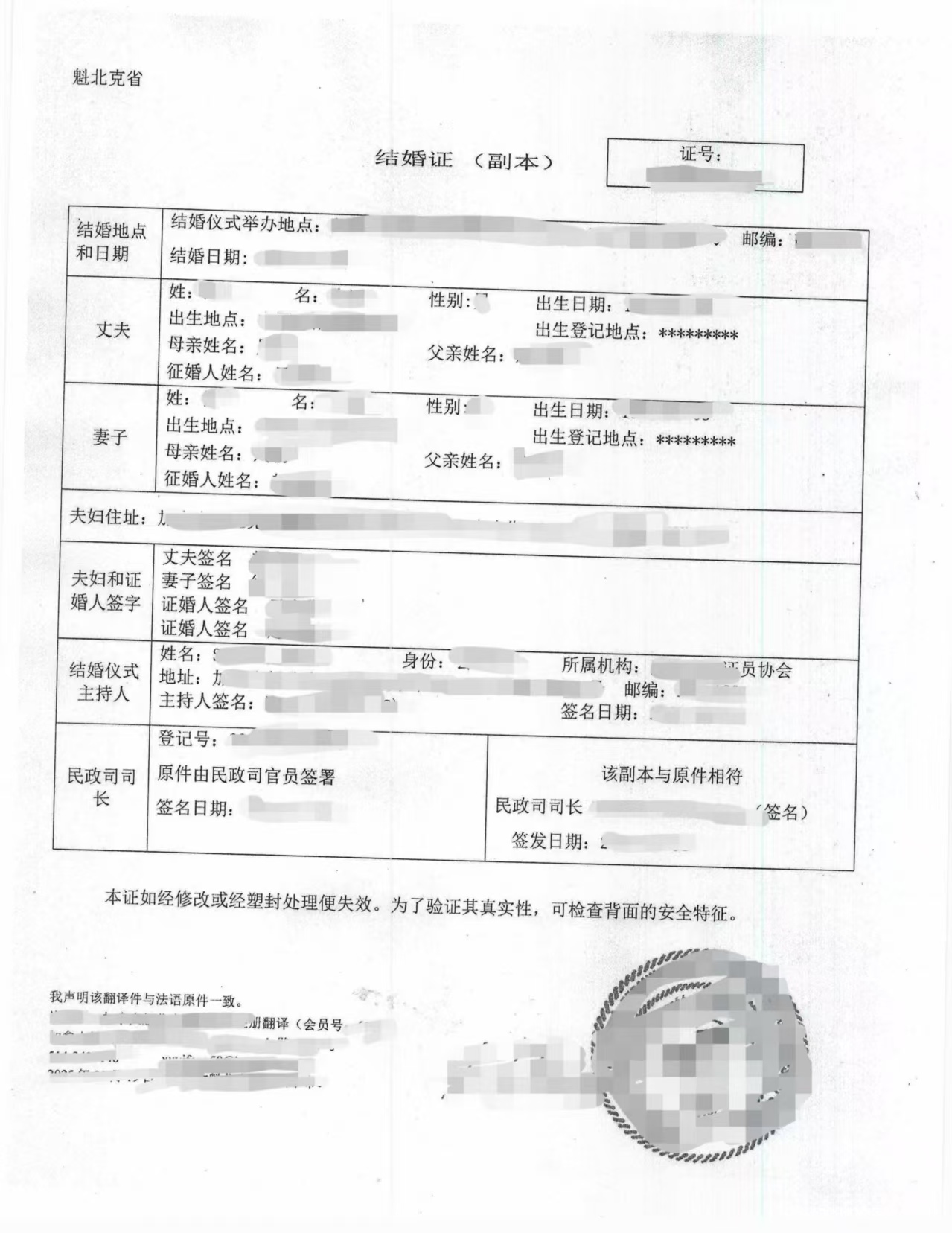 王先生夫妇的结婚证经 OTTIAQ 译员认证后,连同原件送交魁北克司法部办理 Apostille,获得“海牙附加证明”。认证文件随后寄往中国使用,过程无需额外公证。