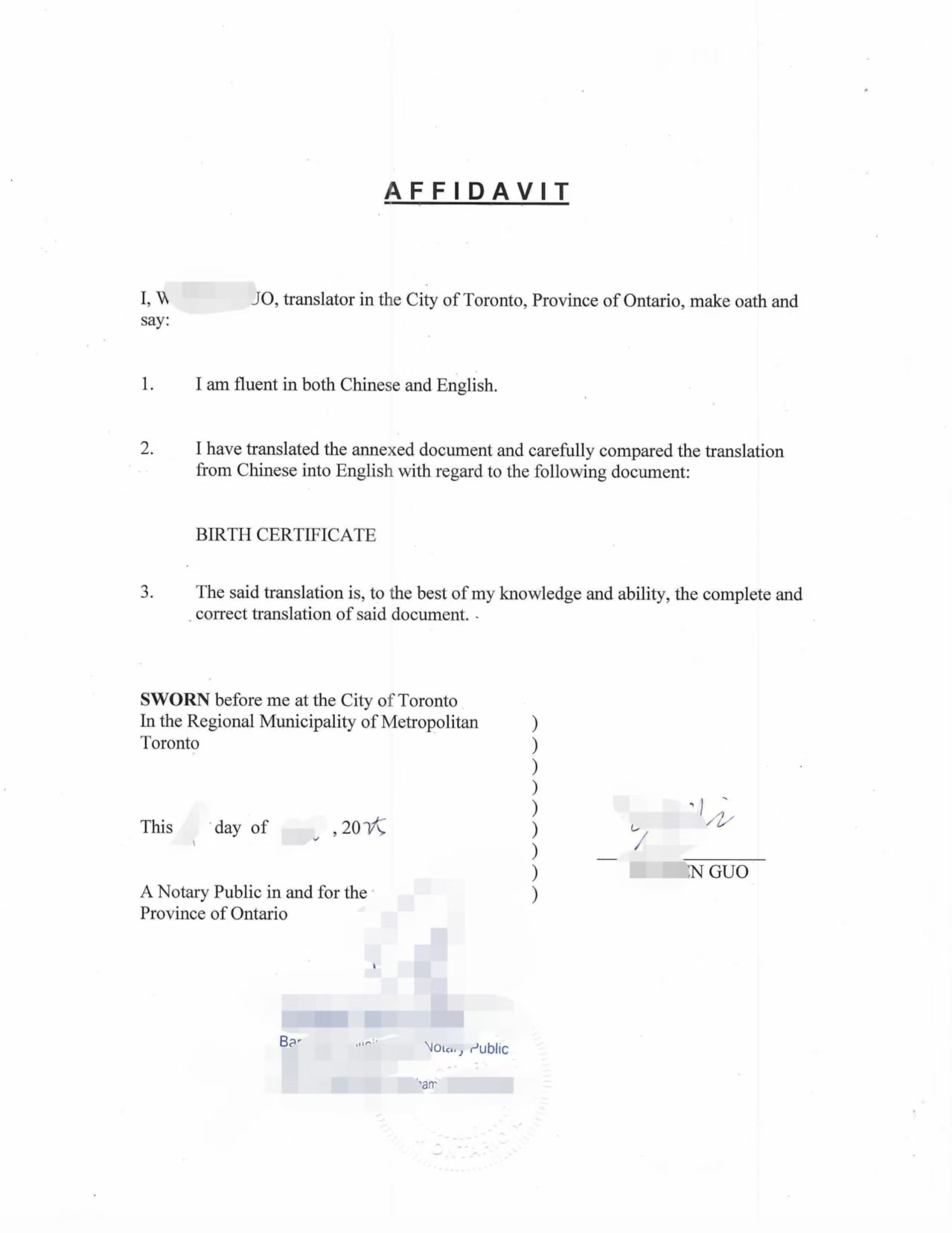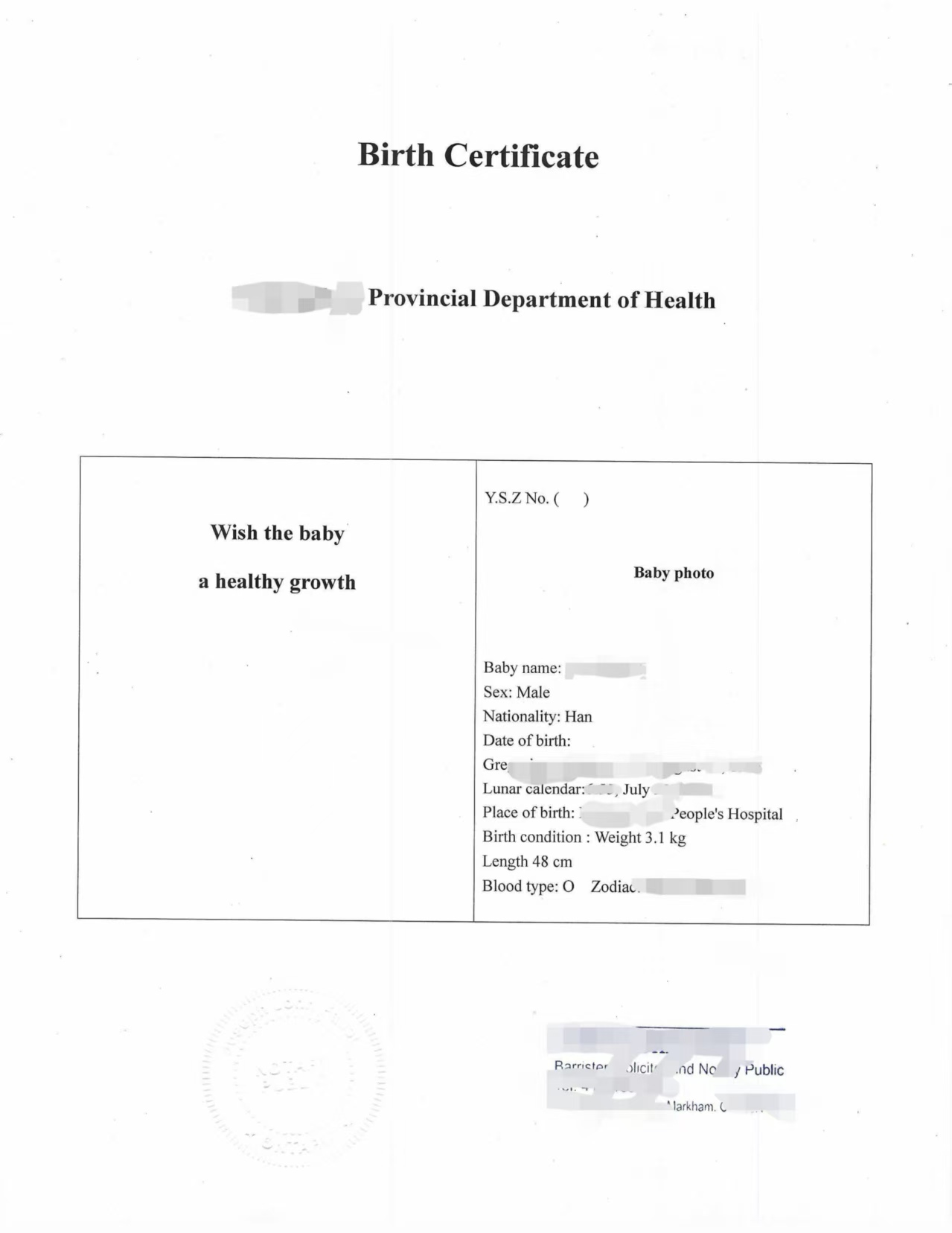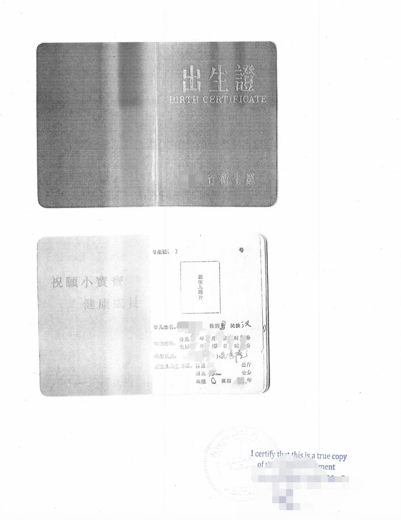 李女士的家人居住在中国,而她本人不便回国办理。经朋友推荐,她联系了位于多伦多的 加拿大华译网华人公证处。李女士仅通过电子邮件发送了两份扫描件——孩子的中国出生医学证明与家庭户口簿首页。华译网立即安排专职认证译员进行精确翻译,译文严格按照英国教育机构格式要求制作,包括出生地、签发机关、签发日期、监护人姓名等信息。
