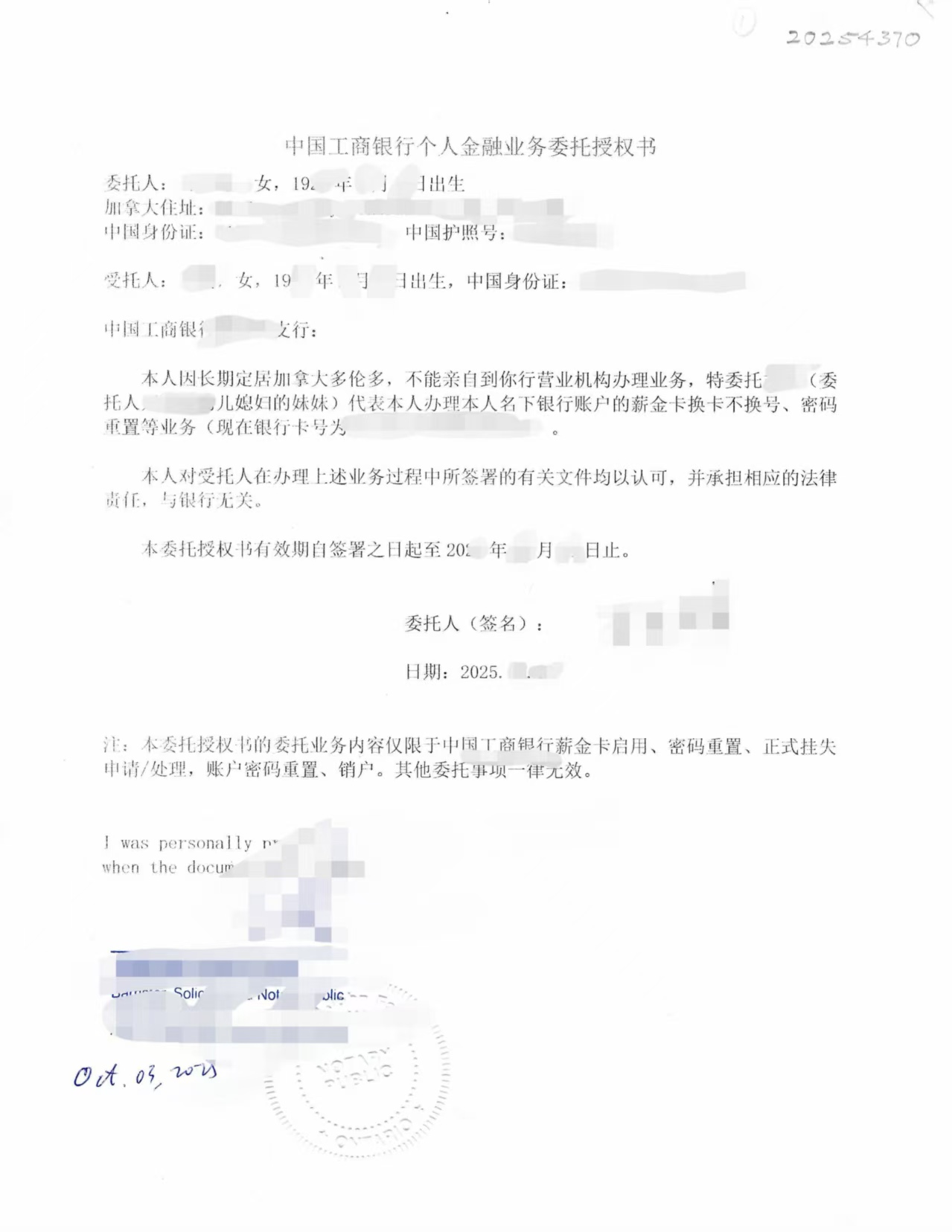 当事人王淑珍女士(化名,WANG SHUZHEN),现年一百岁,定居于加拿大安大略省密西沙加市(Mississauga, Ontario)。王女士在中国重庆市工商银行开设有个人薪金账户。由于年事已高且长期居住海外,无法亲自回国办理账户启用、密码重置及挂失手续,因此决定委托中国亲属代为处理相关银行业务。