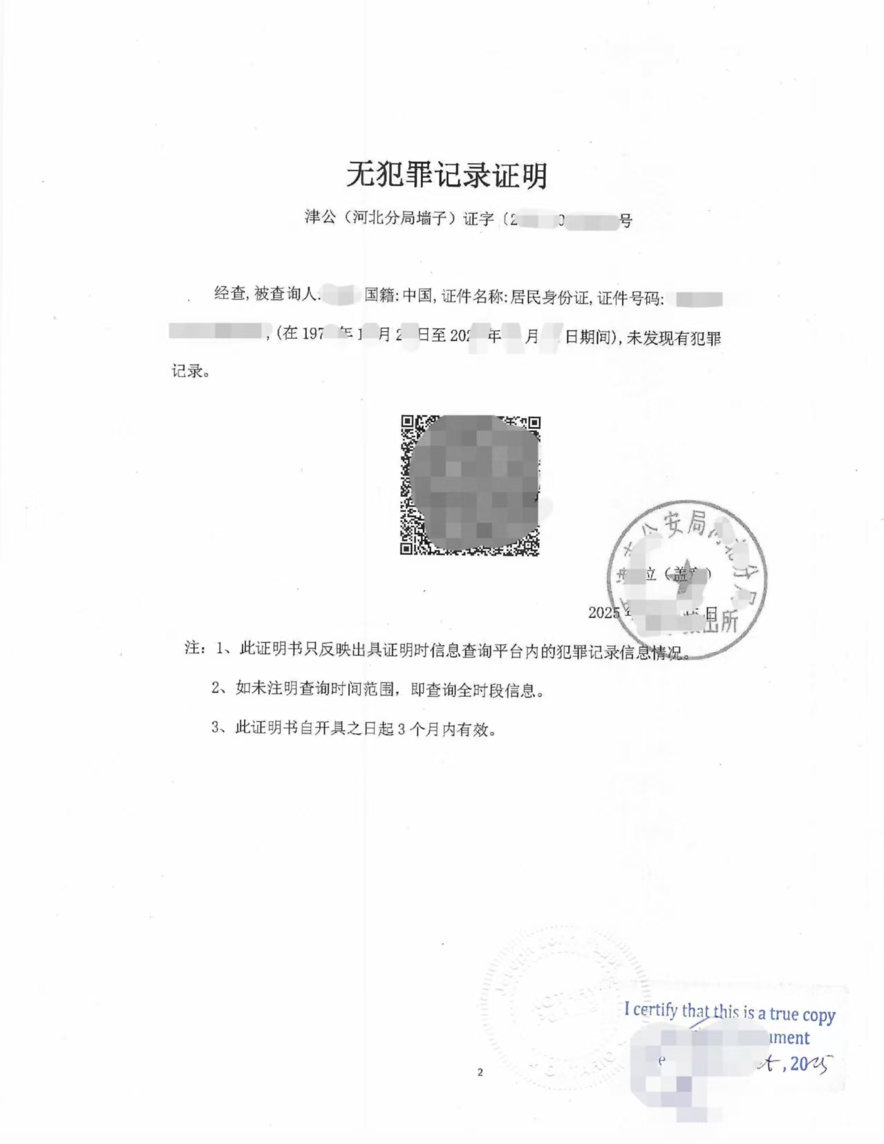 陈女士通过电子邮件发送了天津公安局签发的无犯罪记录扫描件。华译网安排具有法律翻译资质的译员完成中译英翻译(Certified Translation Chinese → English),译文内容包括: