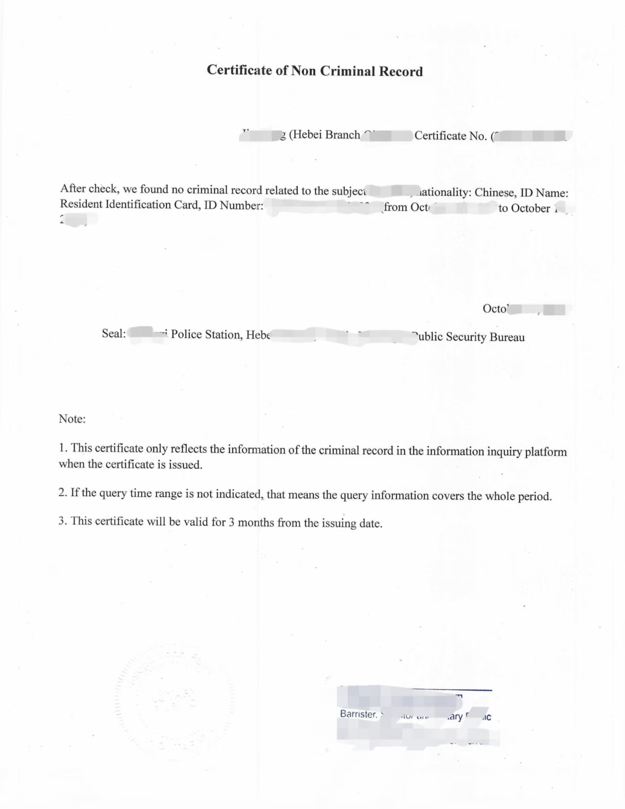 加拿大移民、难民与公民部(IRCC)在审核阶段要求申请人提交中国期间的无犯罪记录证明(Police Certificate / Background Check Result),以核实其在华居住期间是否存在刑事记录。