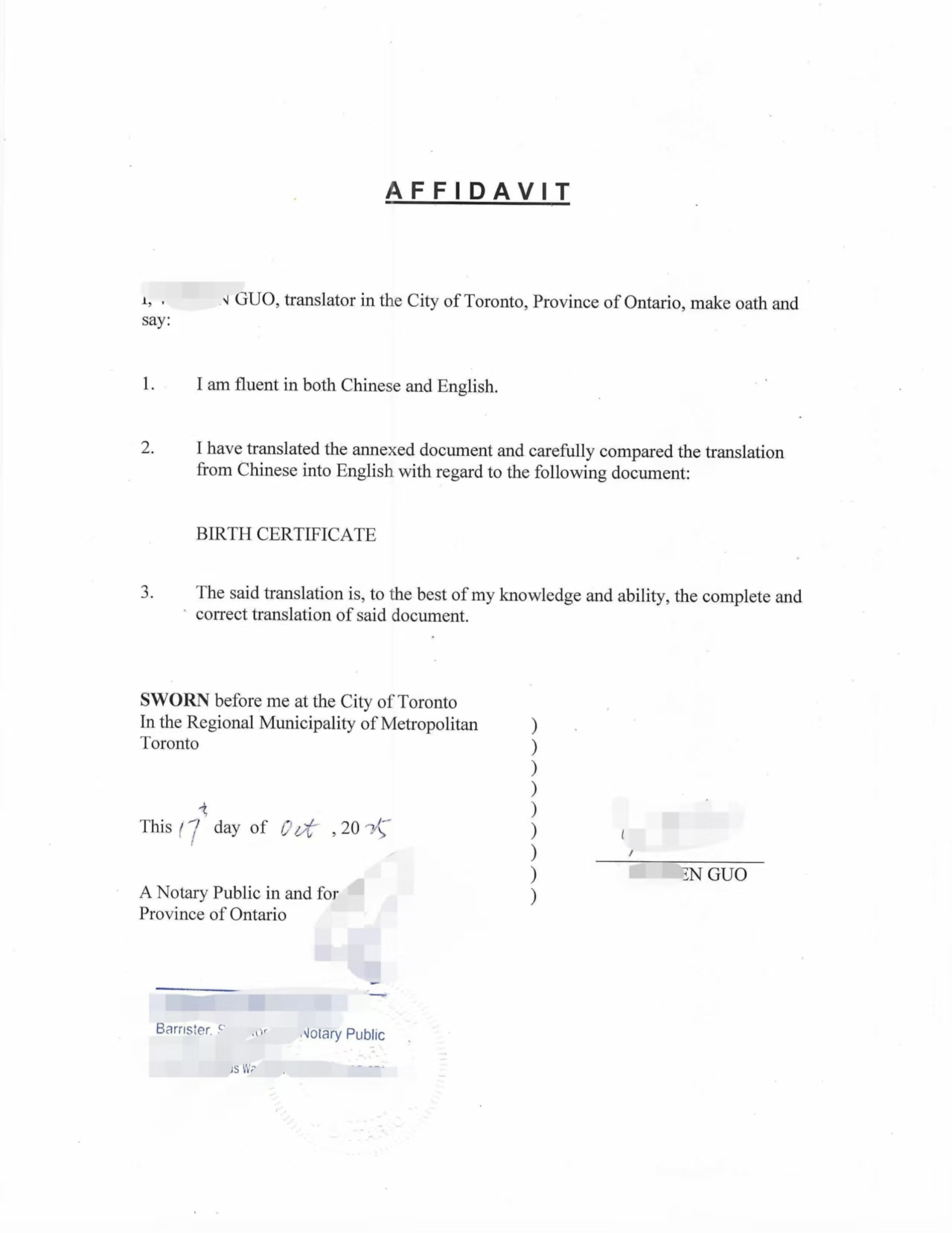 2025 年初,李女士在协助子女办理 加拿大公民入籍申请(Citizenship Application) 时,收到加拿大移民、难民与公民部(IRCC)的文件清单通知,要求提供该出生证明的 英文翻译及公证件。
