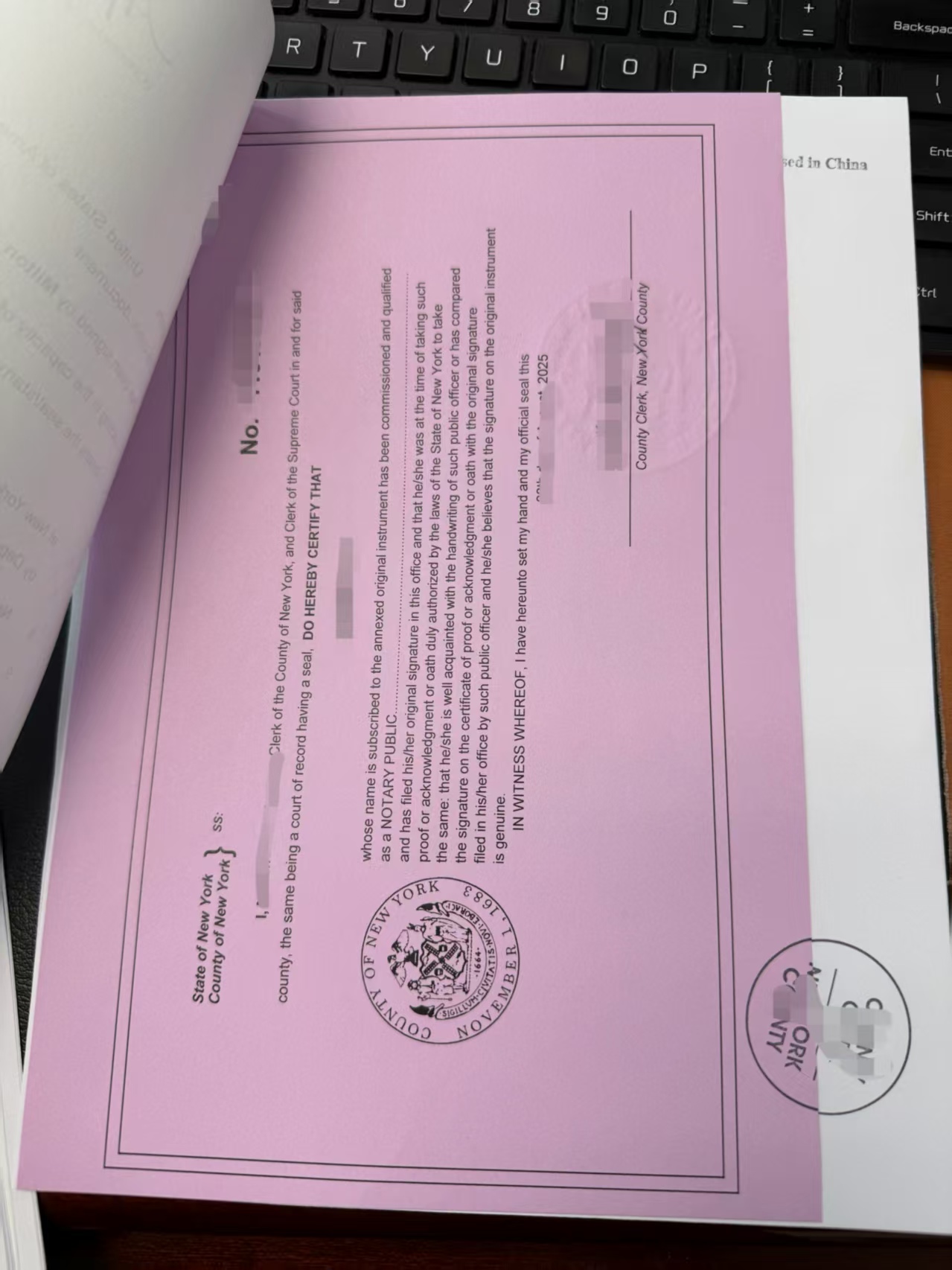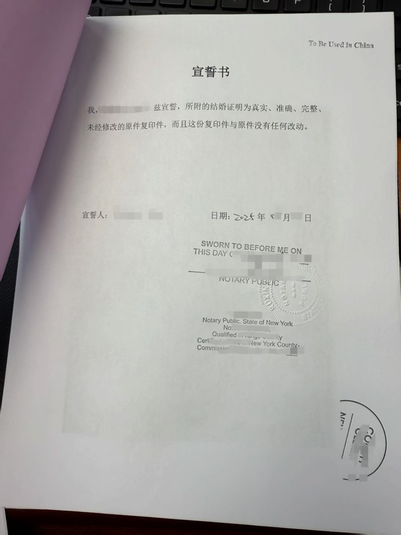 当事人因长期居住纽约,需将德州结婚证交由纽约注册律师进行公证。律师核验身份与文件真伪后,在文件上加盖“Notary Public, State of New York”印章,并附签字声明。