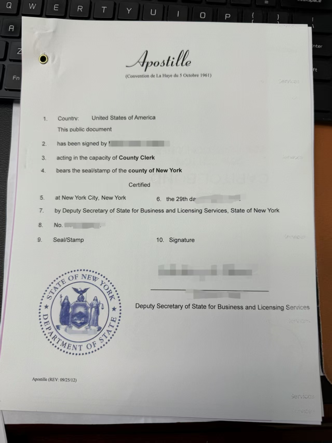 县政府认证完成后,文件被送至纽约州务卿办公室(New York Department of State)办理海牙认证。