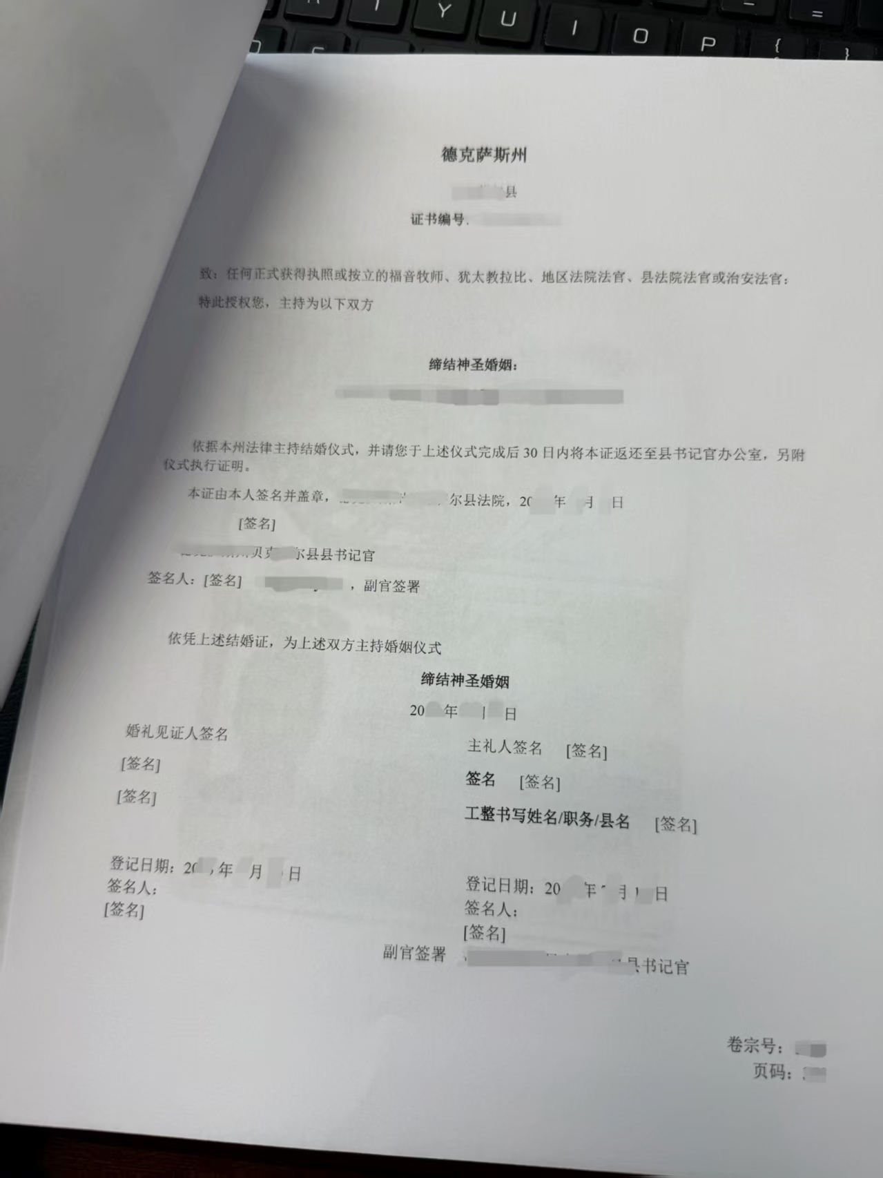 夫妻双方在德州合法登记结婚后,由达拉斯县书记官办公室(Dallas County Clerk)签发结婚证书。证书须为正式副本,印有县政府浮雕印章和签署官员签名。