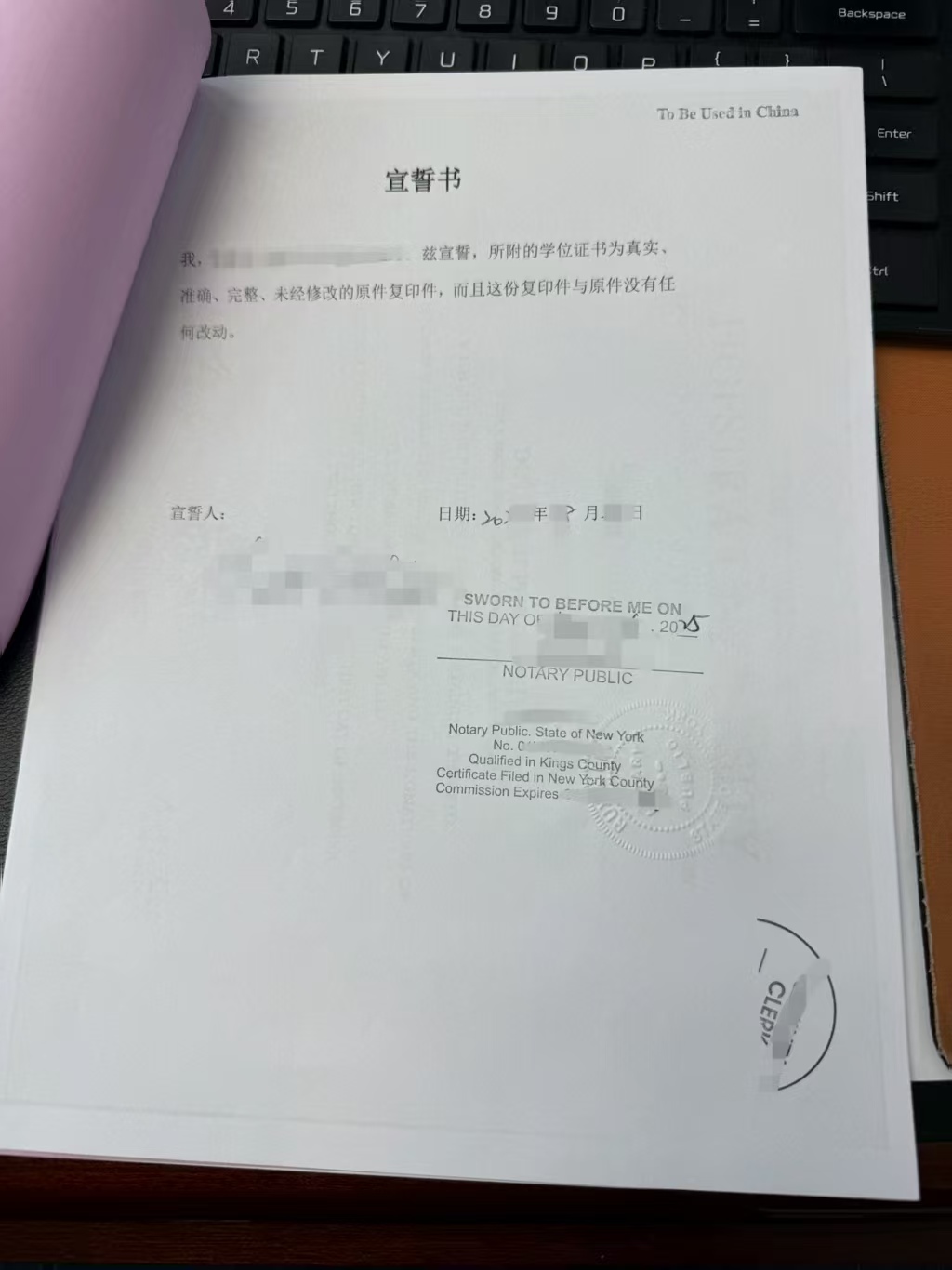 当事人将学位证书原件或学校认证副本交由纽约州注册律师进行公证。律师核验文件来源与签发人签名的真实性后,在文件上加盖“Notary Public, State of New York”印章,并签署声明书,确认文件为真实有效副本。
