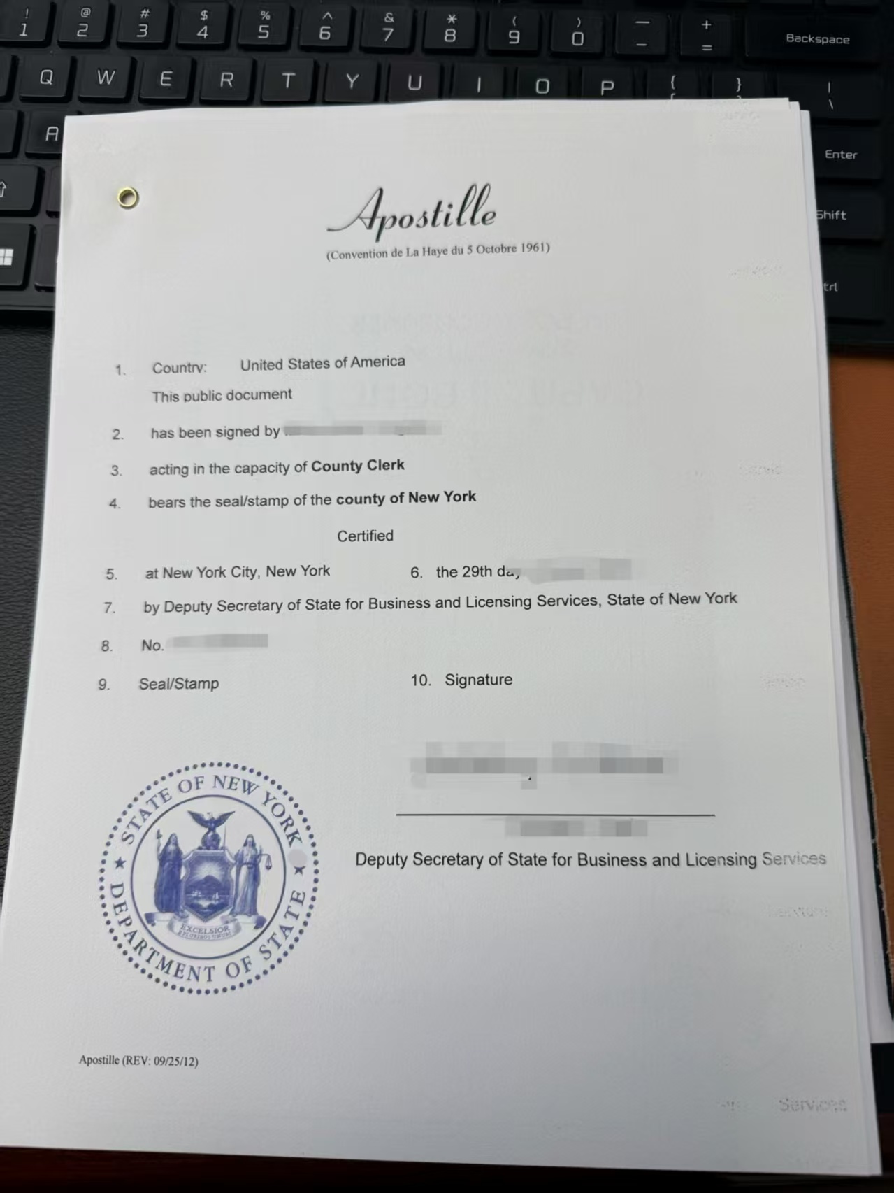 认证方式:纽约律师公证 → 纽约县政府认证 → 纽约州政府海牙认证(Apostille)