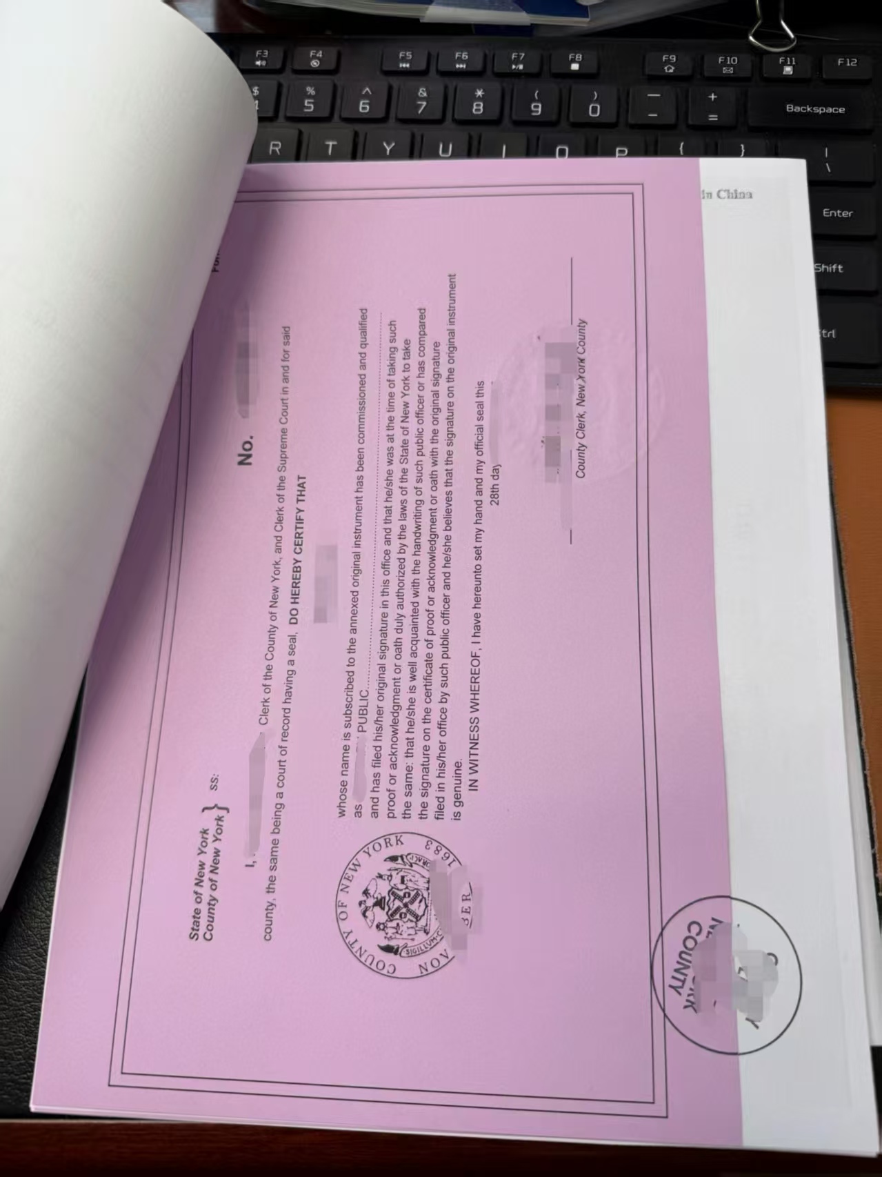 带有律师公证的文件送至纽约县书记官办公室(New York County Clerk)。书记官核对律师公证印章与签名的有效性,并附上《县认证证明书》(Certificate of Authentication),确认该律师为合法公证人。