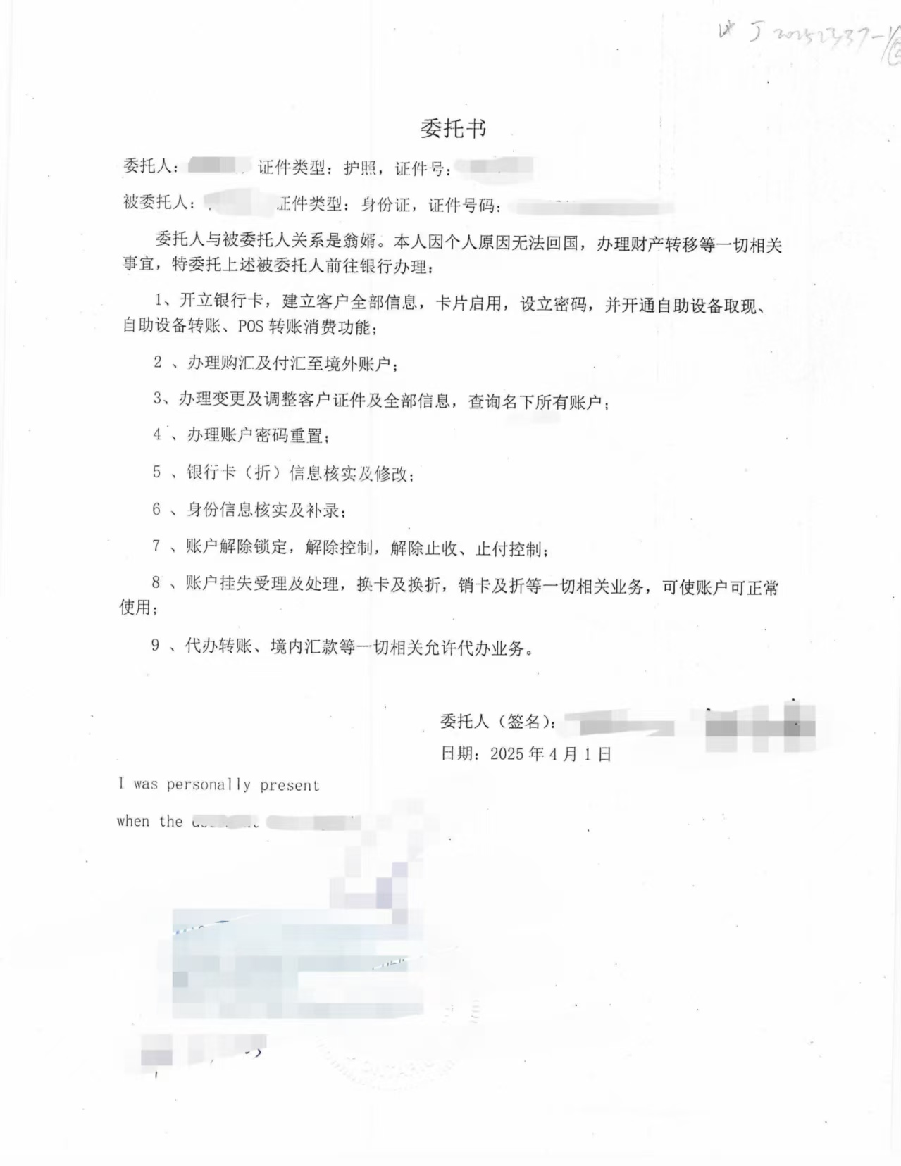 为确保国内银行能够依法认可他人代理操作,须出具一份 银行业务委托书,并完成 公证及海牙认证(Apostille) 程序,方具法律效力。