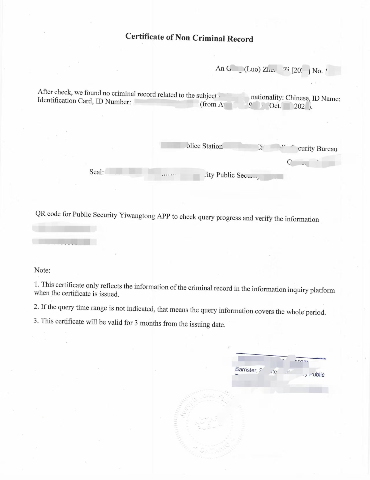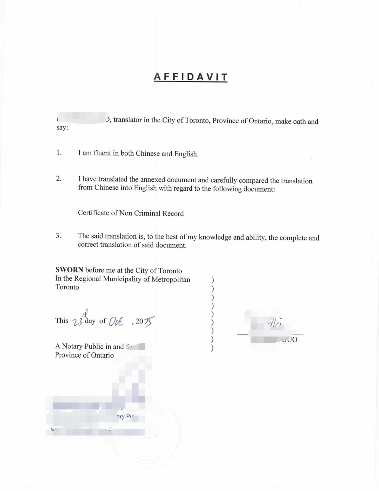 这是一位准备通过加拿大夫妻团聚移民(Spousal Sponsorship)的华人客户的真实案例。客户的移民公司在审核材料时,要求她提交一份中国公安机关出具的无犯罪记录证明(Certificate of Non-Criminal Record),并由加拿大本地认证译员完成英文翻译和公证。